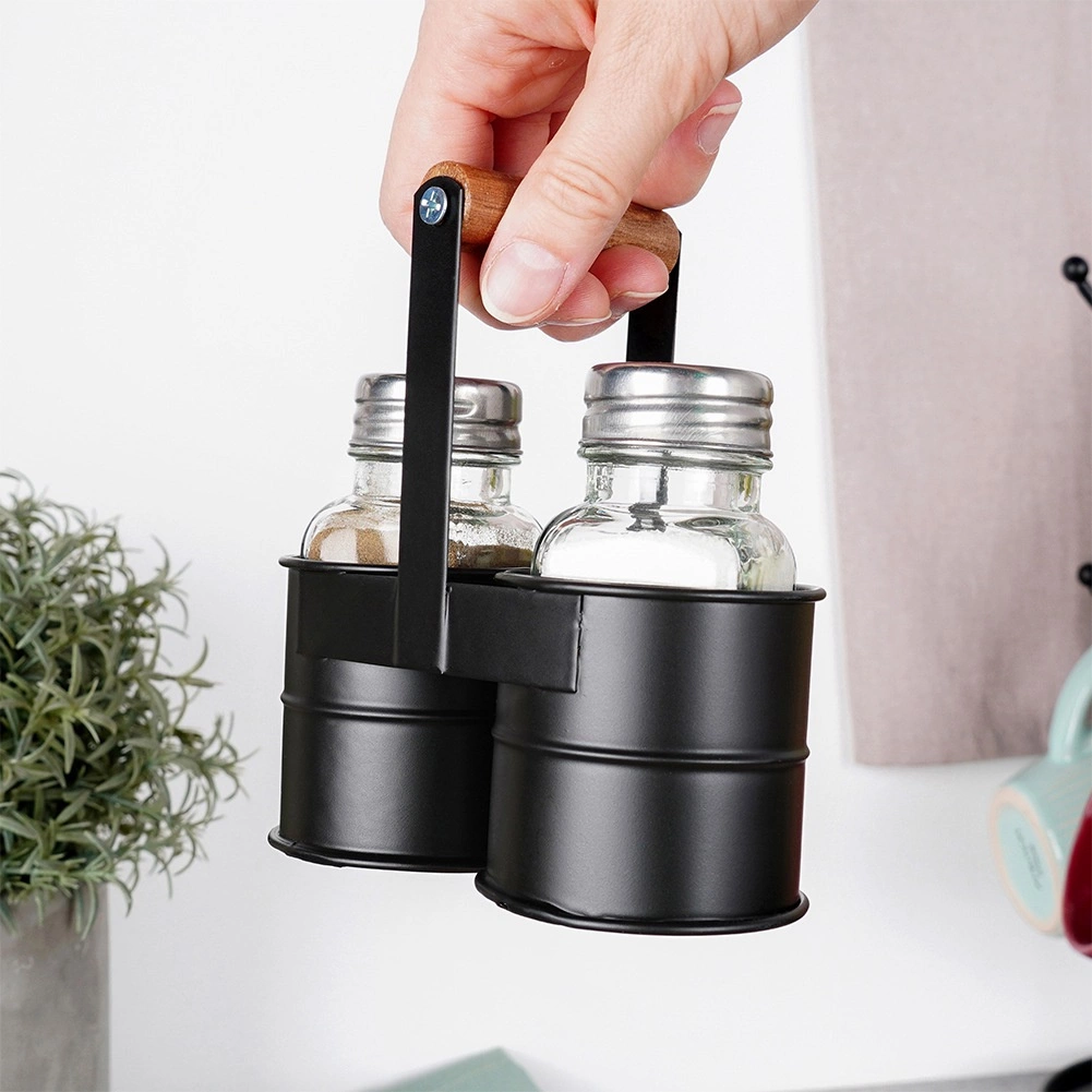 Kompaktno kovinsko stojalo z lesenim ročajem drži solnico in poprnico vedno skupaj ter omogoča enostaven prenos iz kuhinje na mizo.