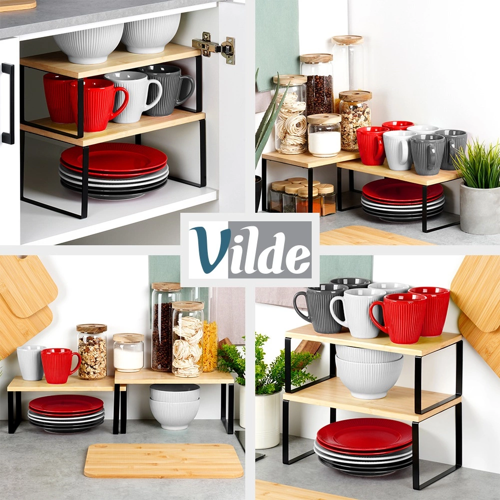 Set vsebuje dve univerzalni polici, ki takoj povečata shranjevalni prostor v kuhinji, shrambi in kopalnici. Večja polica: 33,5 × 19,5 × 16 cm, manjša polica: 33,5 × 18,5 × 13,5 cm. Vzporedno postavljeni ponujata skupno dolžino 67 cm. Odporna bambusova plošča in stabilna kovinska konstrukcija zagotavljata dolgo življenjsko dobo tudi pri vsakodnevni uporabi.