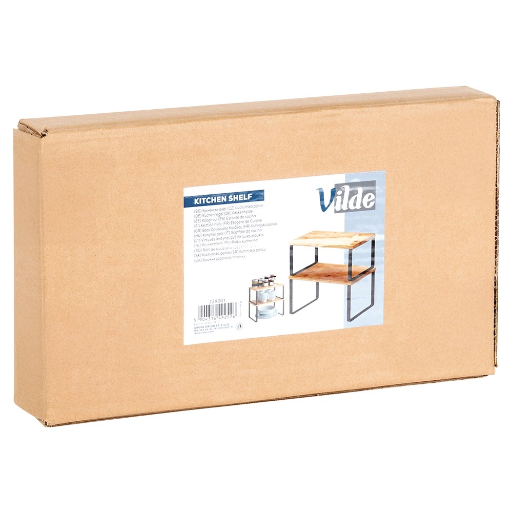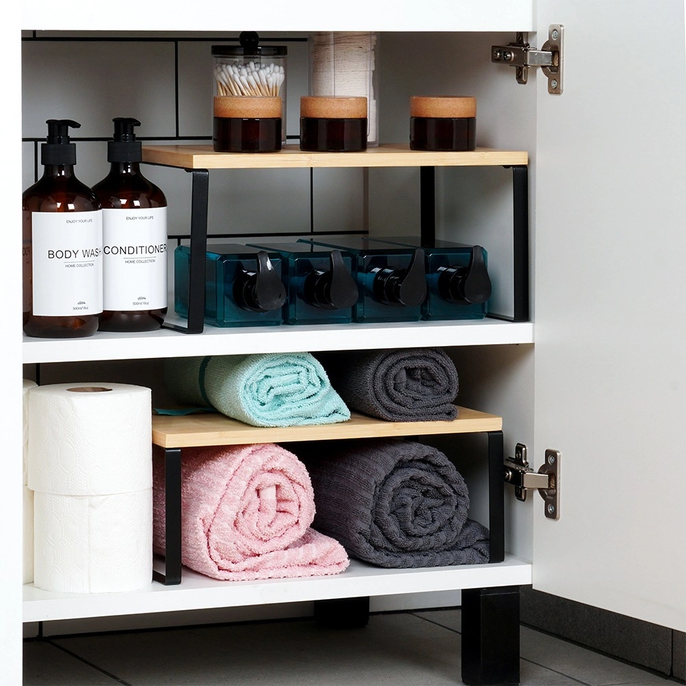 Praktičen set dveh kuhinjskih polic iz bambusovega lesa s trdno kovinsko konstrukcijo v črni barvi vam pomaga ustvariti več prostora na delovni površini in v omaricah. Police lahko zlagate, potisnete eno pod drugo ali razporedite druga ob drugo, zato preprosto prilagodite organizacijo prostora svojim potrebam. Idealne za začimbe, skodelice, sklede in posode, hkrati pa se ujemajo z modernim interierjem zaradi kombinacije svetlega lesa in črne kovine.