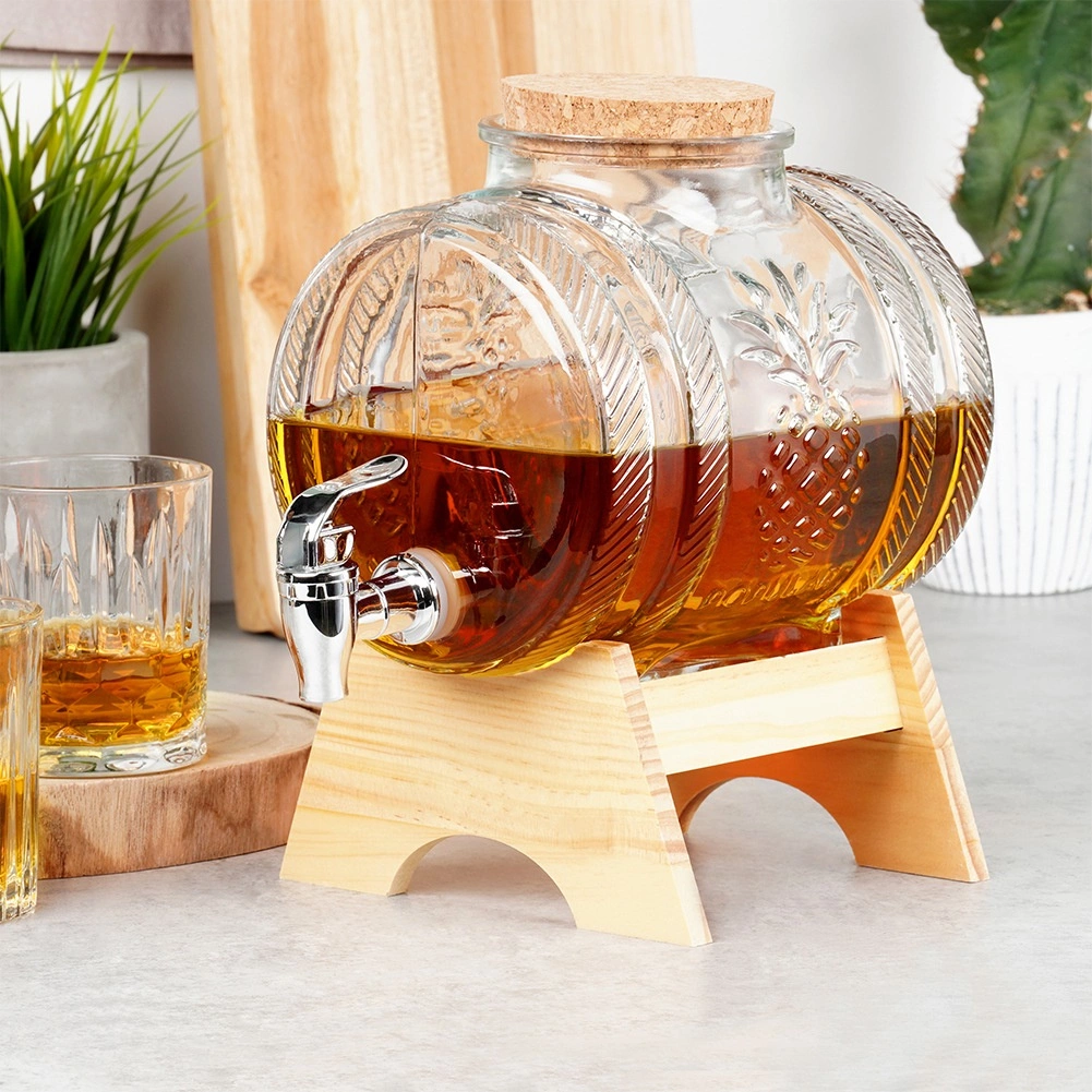 Eleganten stekleni dozirnik pijač s prostornino 3 l in stojalom je idealen za serviranje limonad, sokov ali ledenega čaja. Ima obliko soda z ananasovim reliefom, praktično pipico za enostavno točenje, širok vrat za udobno polnjenje in čiščenje ter naravni plutovinasti pokrov, ki pijačo ščiti pred nečistočami in insekti. Stabilno bambusovo stojalo dvigne posodo na idealno višino za udobno uporabo.
