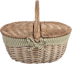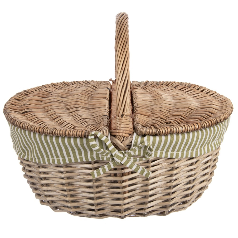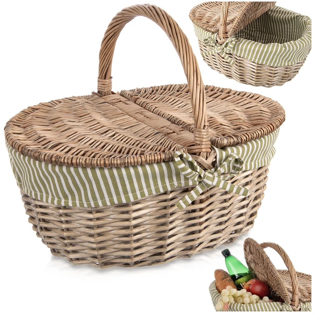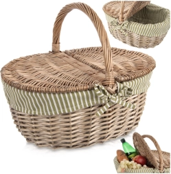 Elegantna pletena piknik košara z dvosmerno odpirajočim pokrovom in čvrstim ročajem je idealna za izlete in obisk parka. Ima odstranljivo tekstilno podlogo v zeleno-belim črtah, ki jo je mogoče prati, ter ponuja kakovostno ročno izdelavo iz naravne vrbe, dovolj prostora za prigrizke in vsestransko uporabo – od piknika do nakupov in nabiranja gob.