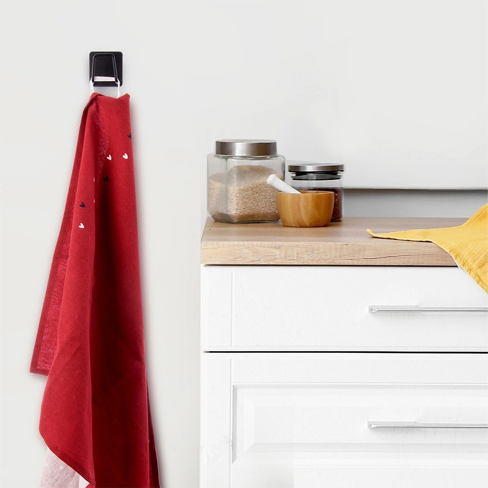 Univerzalni samolepilni kavlji v elegantni črni barvi za kuhinjo in kopalnico. Zahvaljujoč traku 3M držijo trdno brez vrtanja, enostavno se nameščajo in odlično ustrezajo za brisače, krpe, gobice in oblačila. Kompaktne mere in moderen dizajn se zlijejo z vsakim interierjem.
