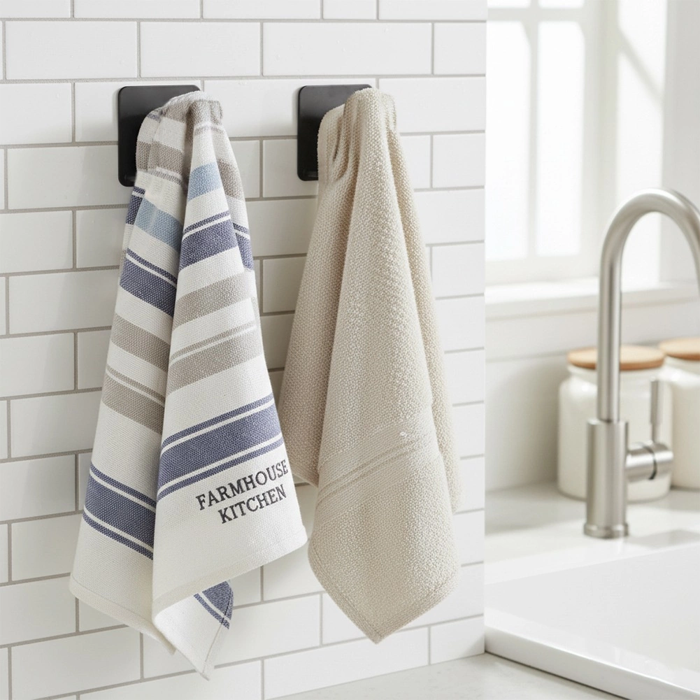 Kavlji imajo dovolj globine za udobno obešanje krp, rokavic ali majhnih gobic za posodo, ki tako lahko hitreje presahnejo in ne ostanejo v vlagi. Namestitev je hitra in brez nereda – dovolj je, da razmastite gladko površino in pritisnete.