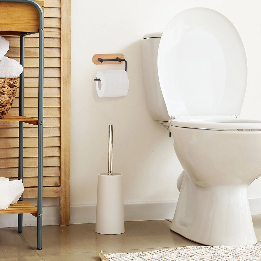Elegantno držalo za toaletni papir prinaša čist dizajn in praktičnost v vsako kopalnico. Kovinska ročica v črni barvi in bambusova osnova se odlično podata k modernim interierjem, hkrati pa zagotavljata vzdržljivost in dolgo življenjsko dobo. Zaradi premišljene oblike je menjava role hitra in udobna.