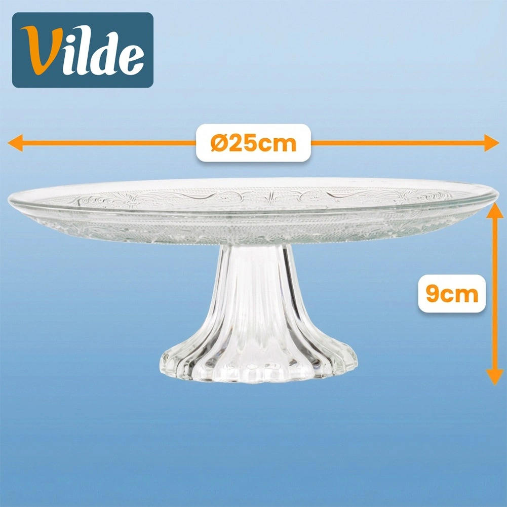 Eleganten stekleni pladenj na nogi s premerom 25 cm za stilsko postrežbo tort, pit in sladic. Prosojno steklo z okrasnim reliefom deluje kot kristal in vaši mizi doda luksuzen videz. Zaradi povišane konstrukcije izstopa vsaka sladica, pladenj je primeren za pomivalni stroj in je odlična izbira za domačo in profesionalno uporabo.