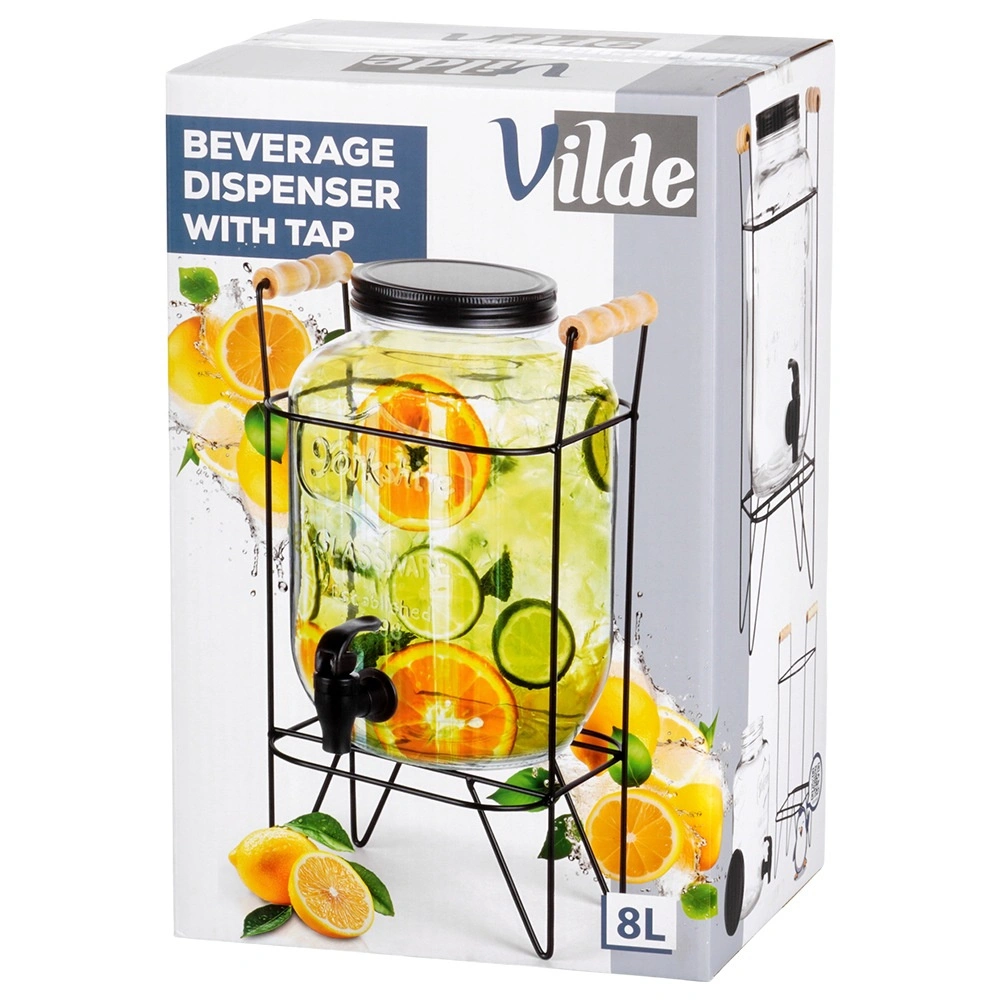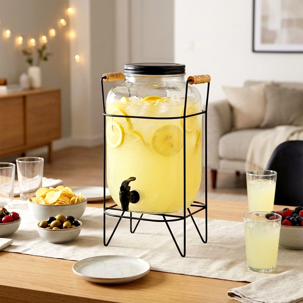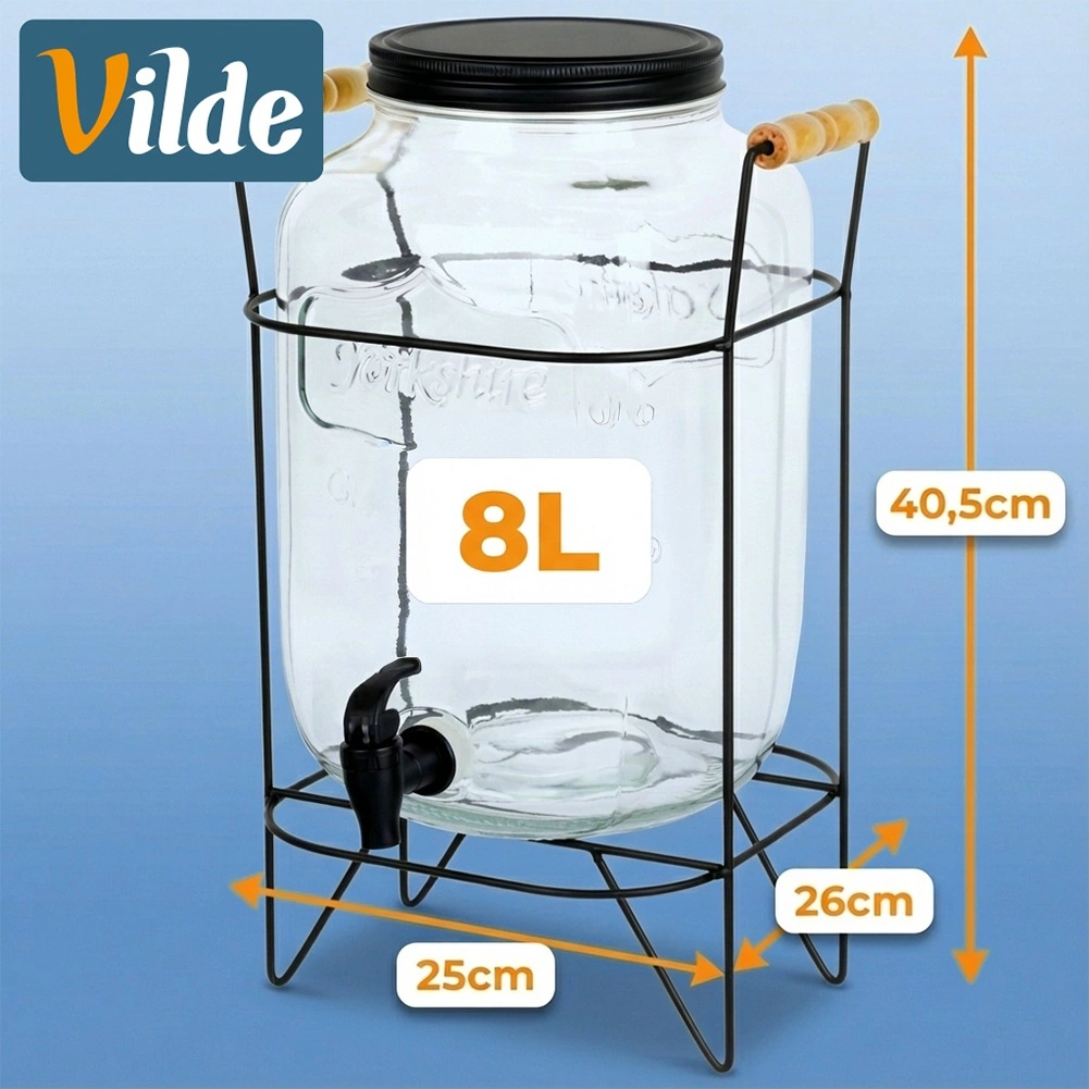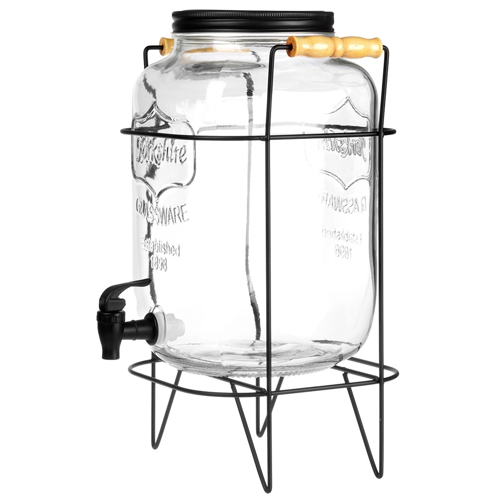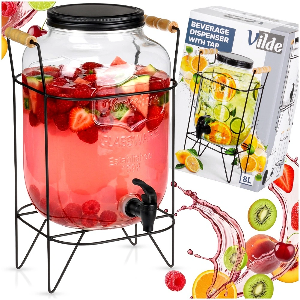Eleganten stekleni dozirnik za pijačo 8 l s stabilnim kovinskim stojalom in priročno pipico za enostavno točenje. Izdelan iz debelega stekla z učinkovitim reliefom, ima privijačilni kovinski pokrov in stojalo z lesenimi ročaji. Idealen za limonado, vodo, ledeni čaj in punč za vrtne zabave in domačo uporabo.