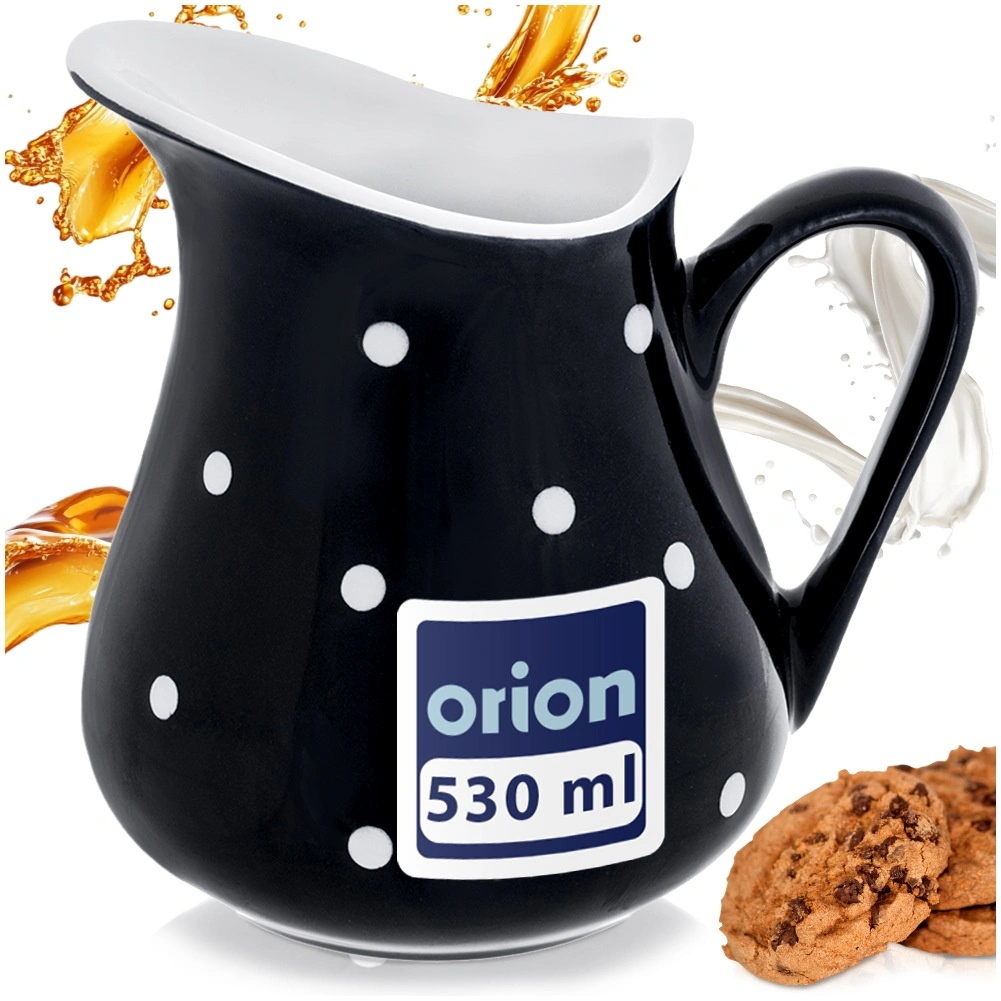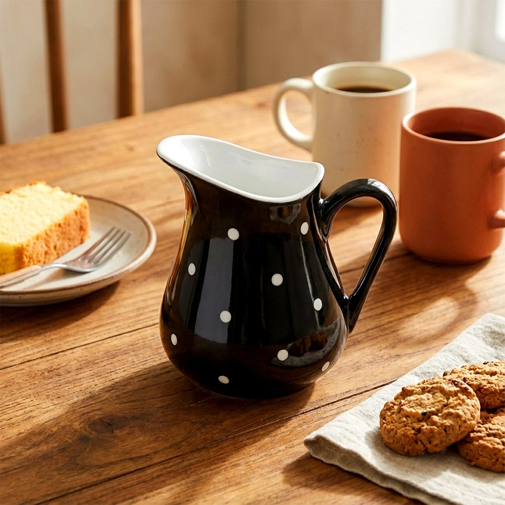 Ta praktični in stilski vrč združuje funkcionalnost z privlačnim dizajnom. Izdelan iz kakovostne keramike v črni barvi z belimi pikami, odlično dopolni vsak zajtrk, kavni servis in slavnostno pogrnjeno mizo. Zaradi univerzalne prostornine 480 ml je primeren za mleko, smetano, omake in osvežilne napitke.