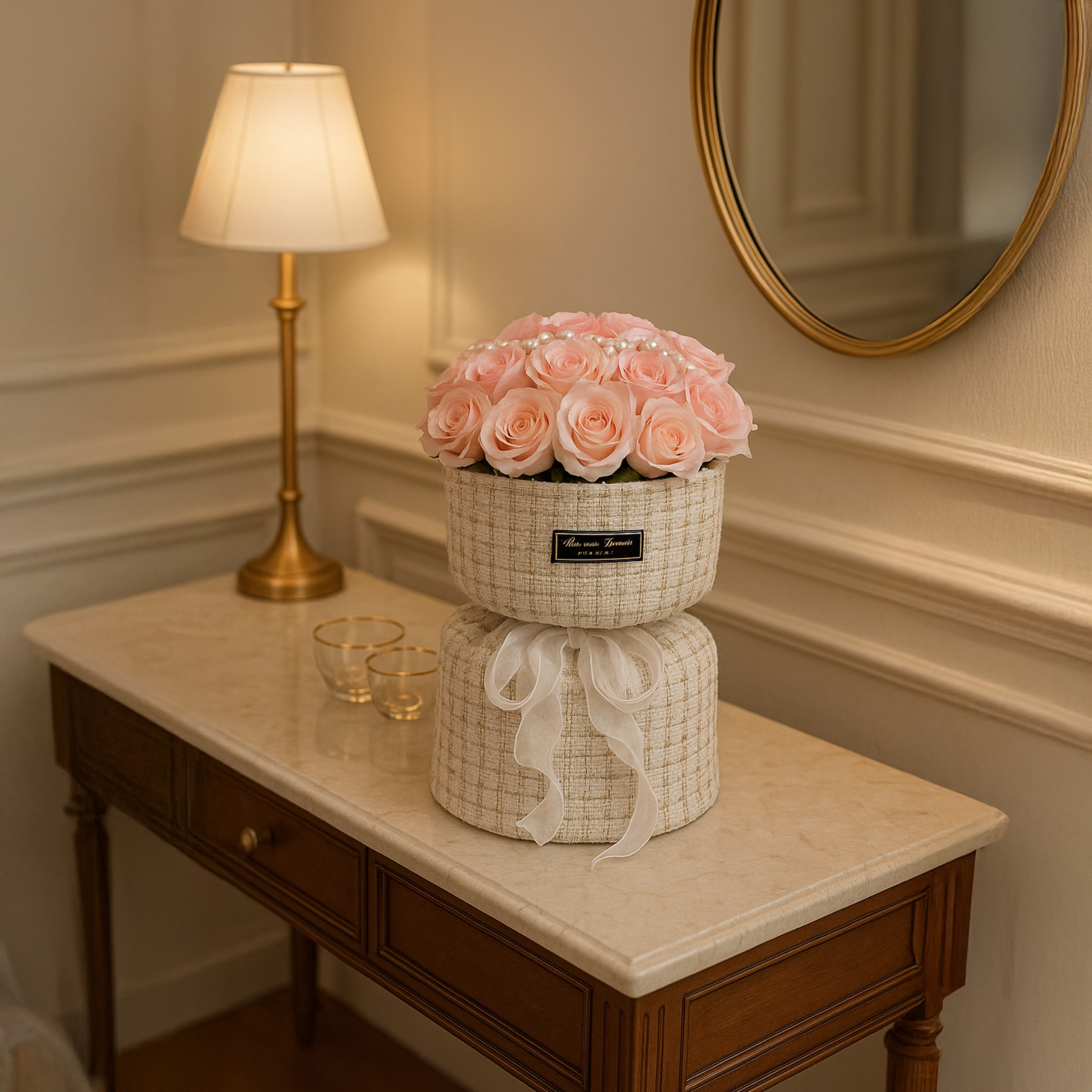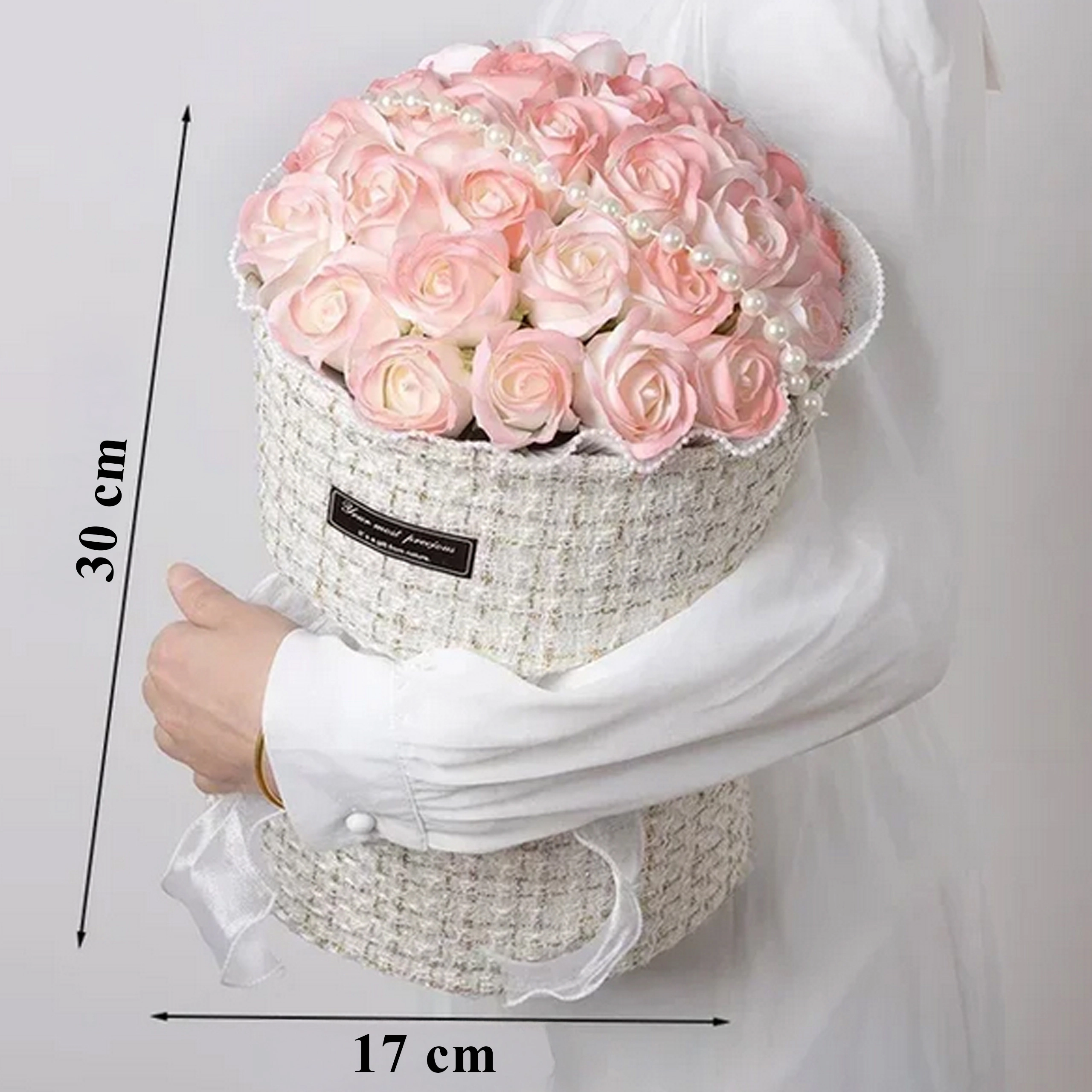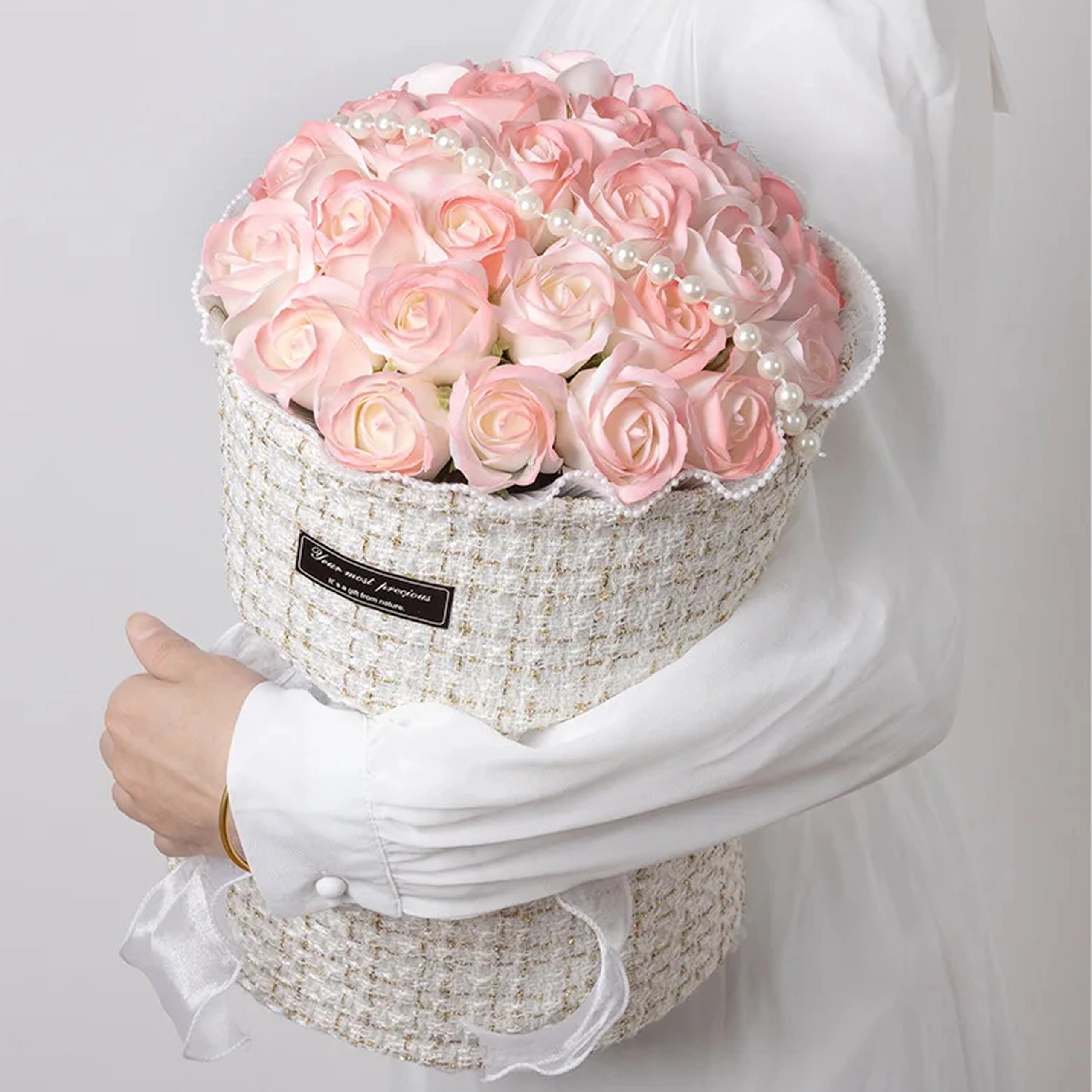 Ta eleganten set rožnatih milnih vrtnic v tekstilnem klobučastem boxu prinaša romantično vzdušje na vsako mizo, komodo ali klubsko mizico. Nežni odtenki rožnate, poudarjeni z biserčki in LED lučkami, ustvarjajo sofisticiran aranžma, ki izgleda sveže, a ne potrebuje nobene nege.