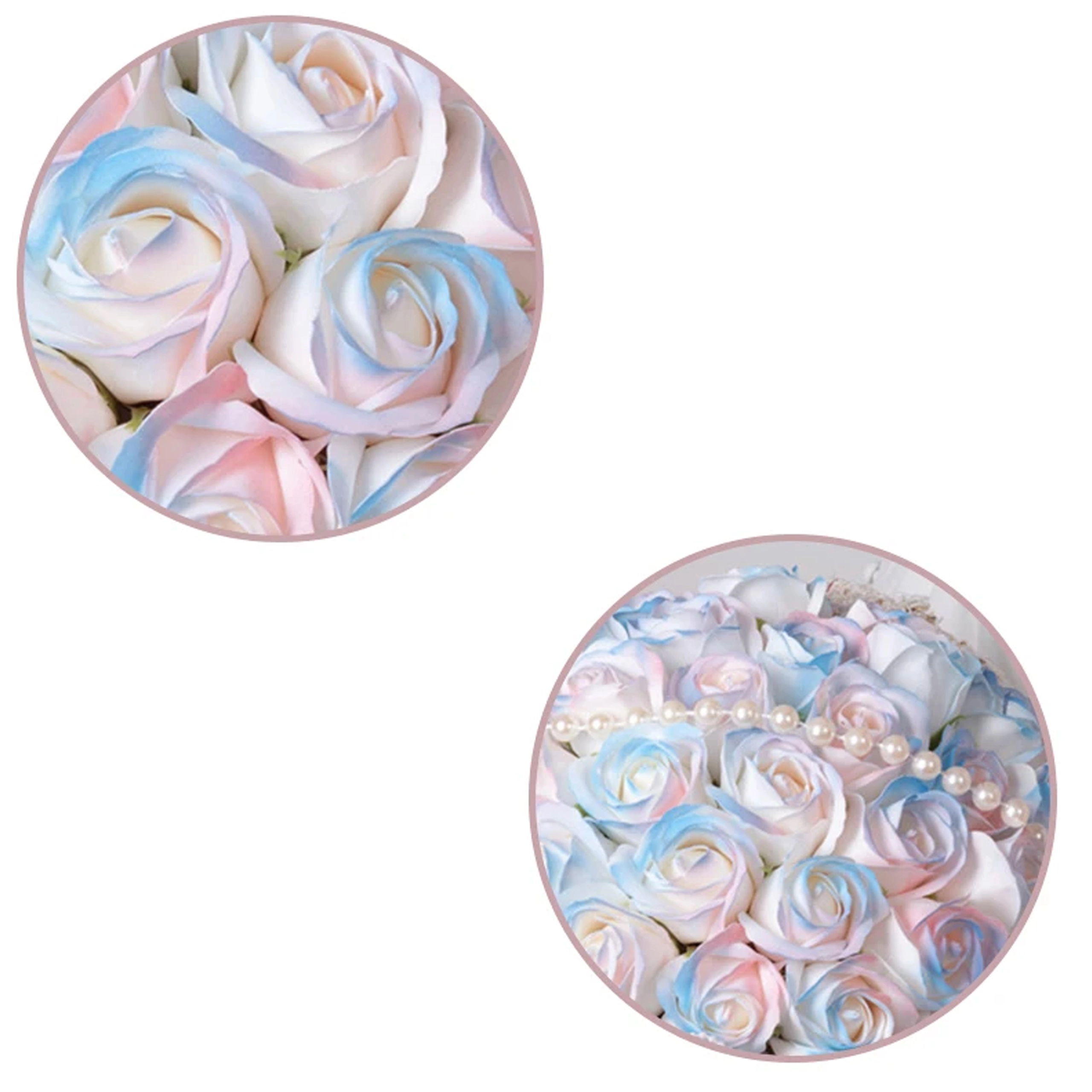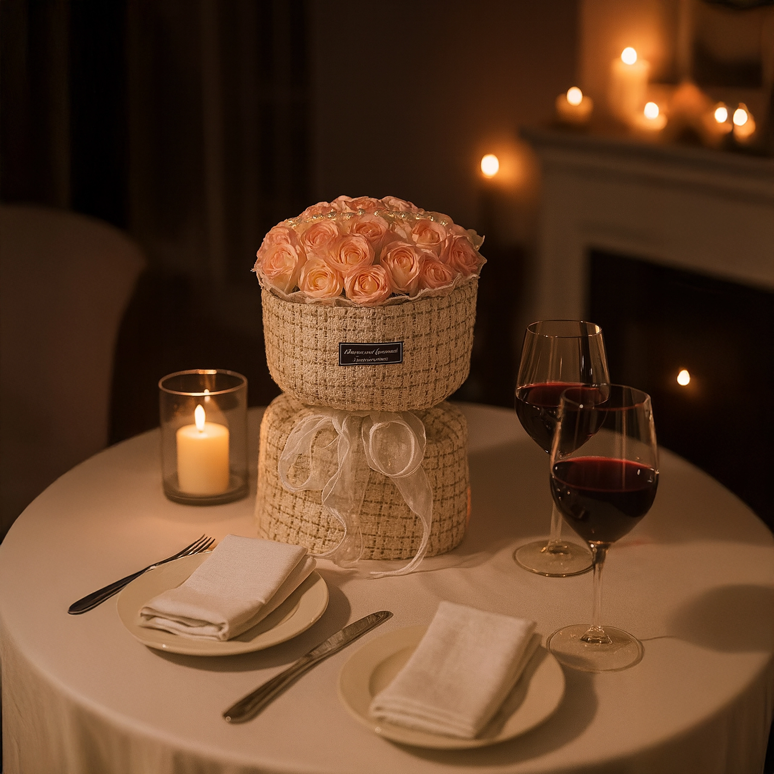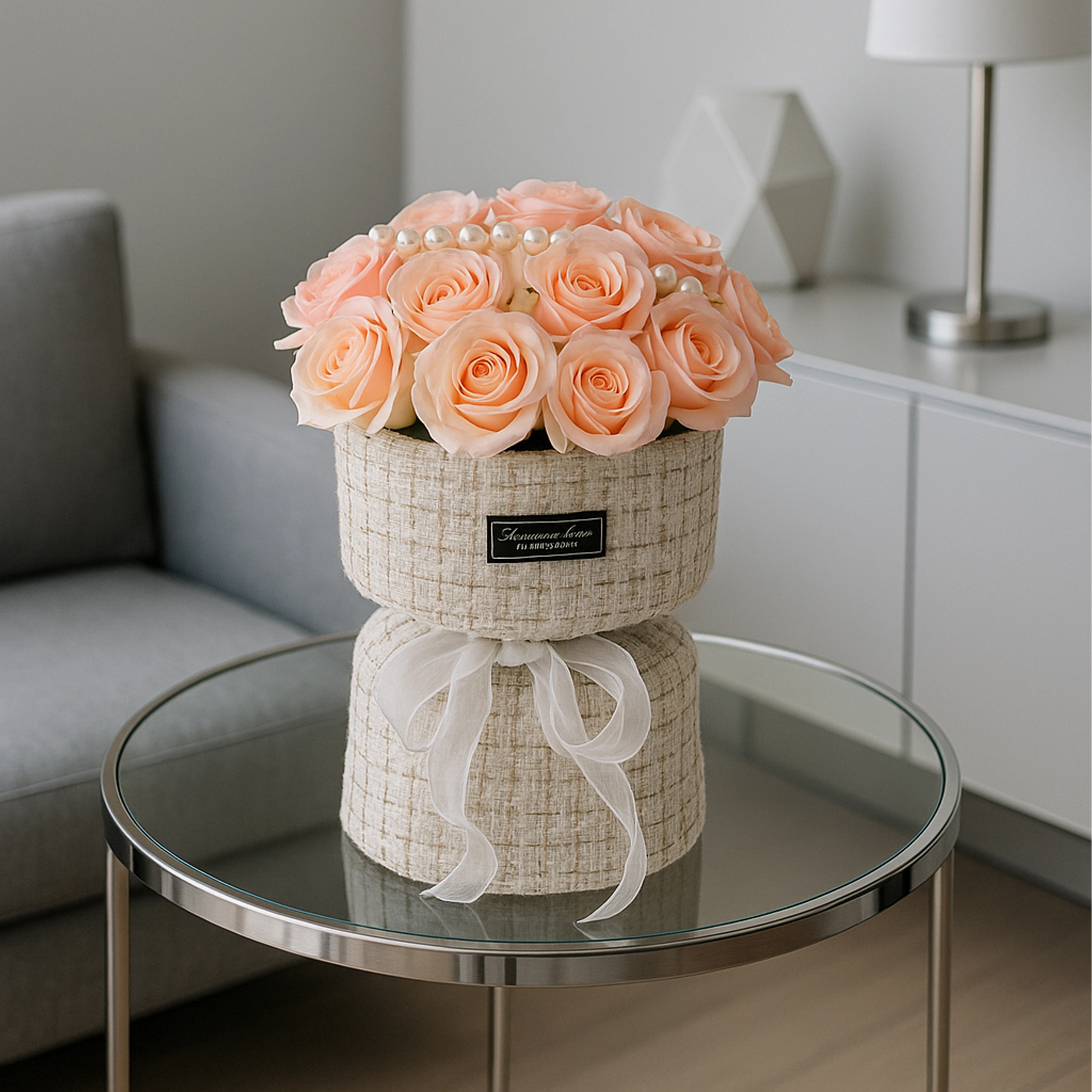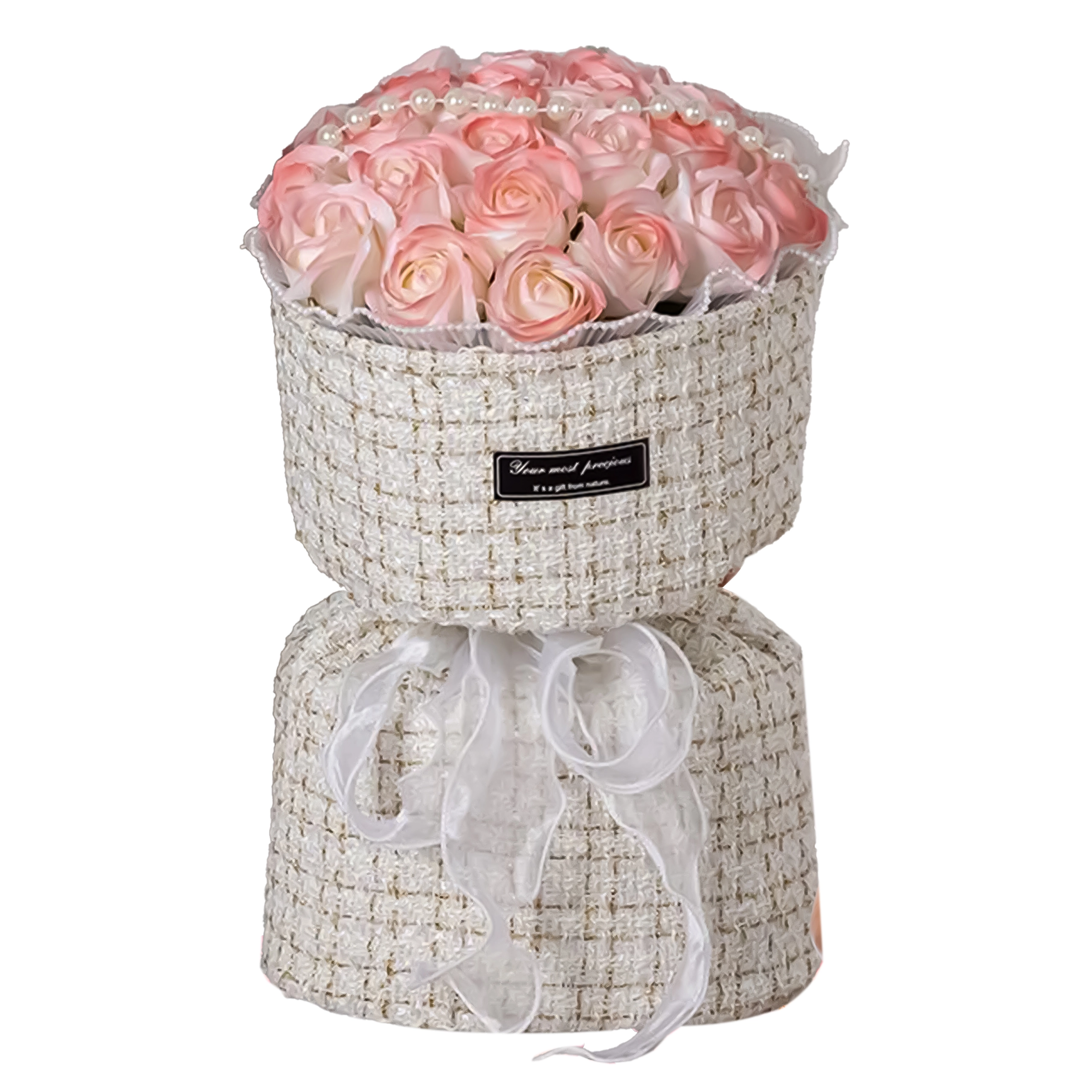 Ta eleganten set rožnatih milnih vrtnic v tekstilnem klobučastem boxu prinaša romantično vzdušje na vsako mizo, komodo ali klubsko mizico. Nežni odtenki rožnate, poudarjeni z biserčki in LED lučkami, ustvarjajo sofisticiran aranžma, ki izgleda sveže, a ne potrebuje nobene nege.
