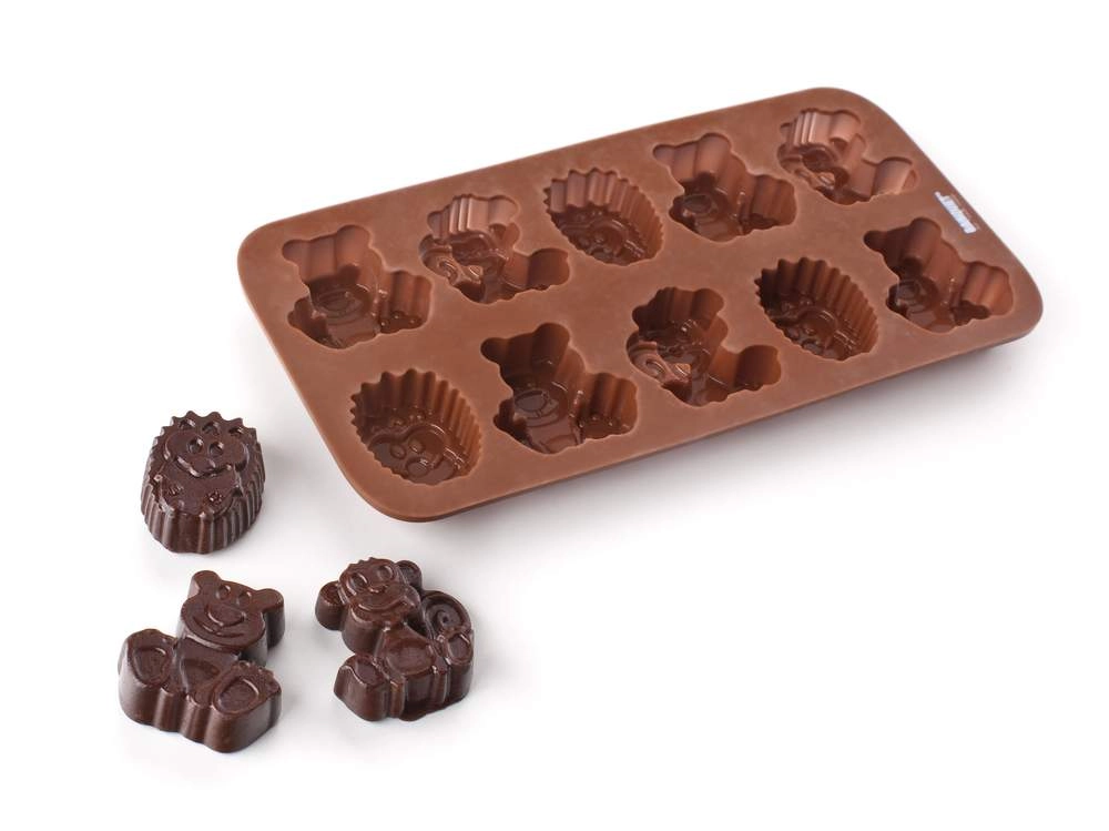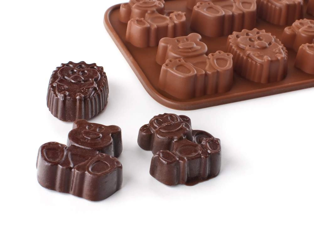 Ta rjav silikonski model z živalskimi motivi je idealen za izdelavo domače čokolade, pralin, karamel in ledenih kock. Zahvaljujoč prožnemu silikonu se končni kosi zlahka odstranijo brez lomljenja, model pa ohranja obliko tudi pri pogosti uporabi.