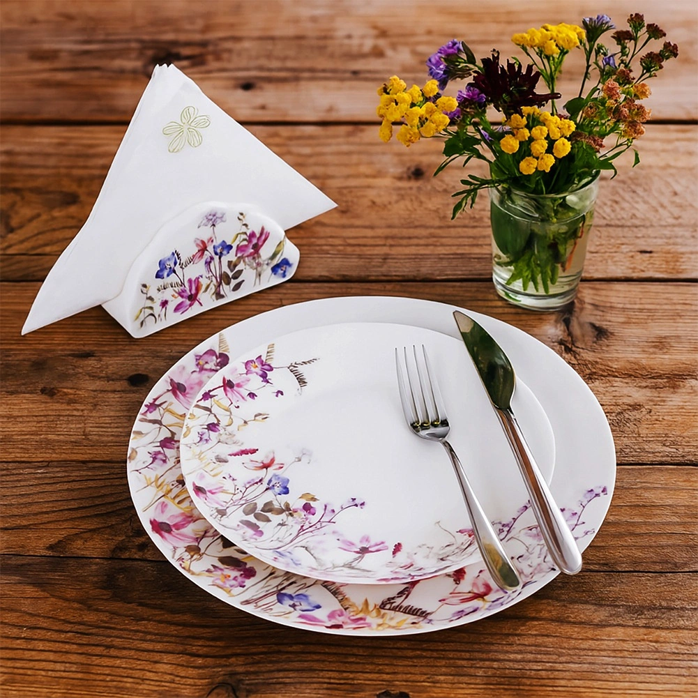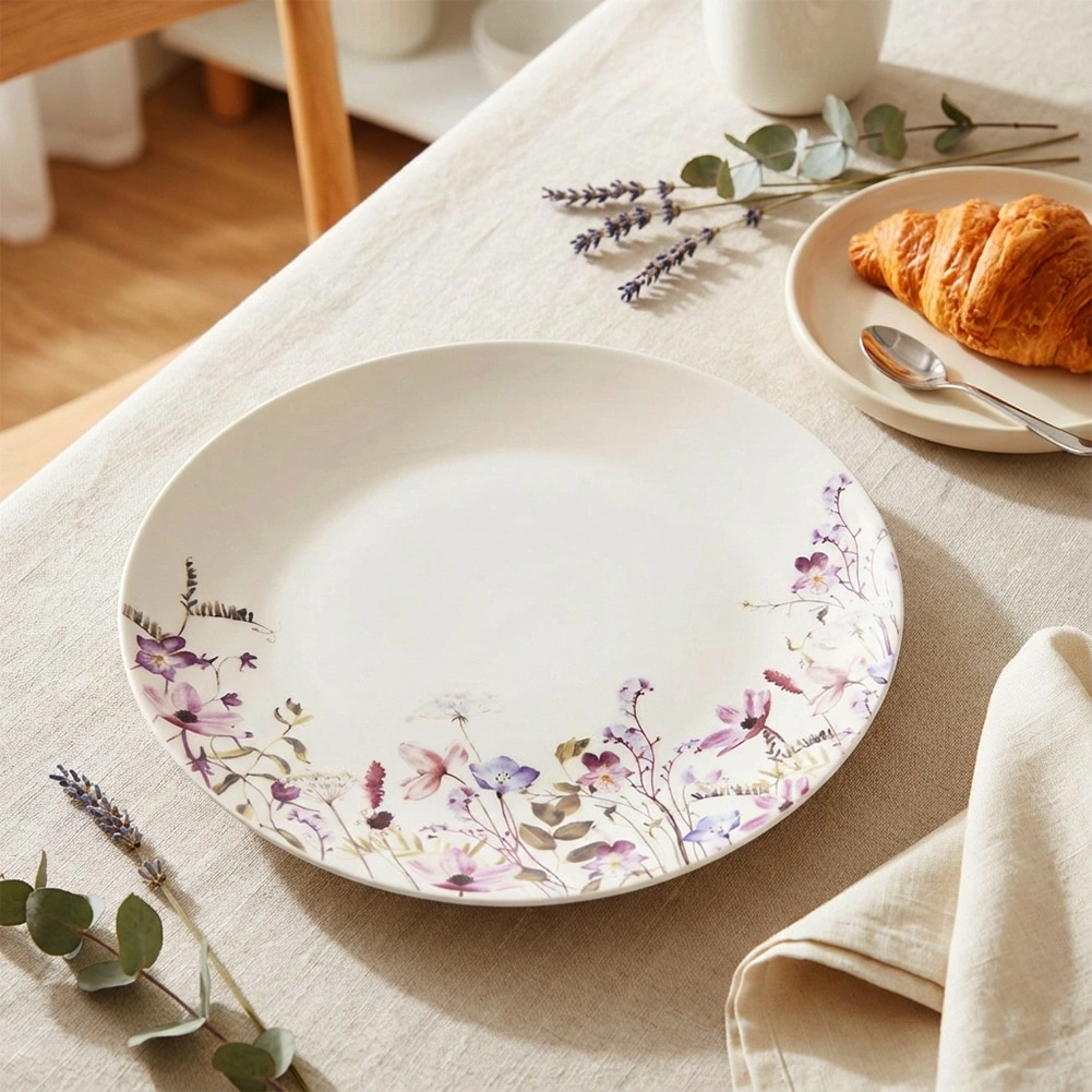 Eleganten porcelanast krožnik za sladice s premerom 20,5 cm z motivom travniških cvetov. Idealen za sladice, prigrizke in zajtrk. Primeren za pomivalni stroj in mikrovalovno pečico, izdelan iz kakovostnega porcelana in se lepo poda k vsaki pogrnjeni mizi.