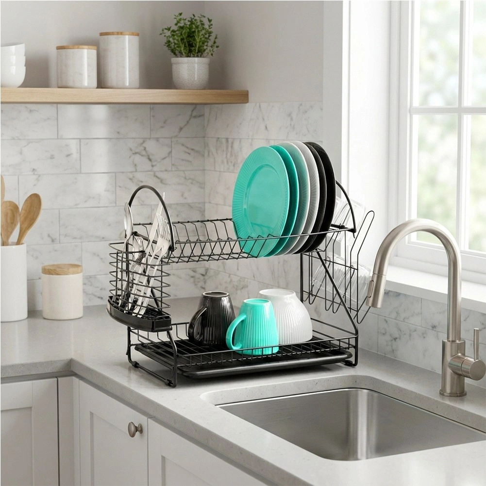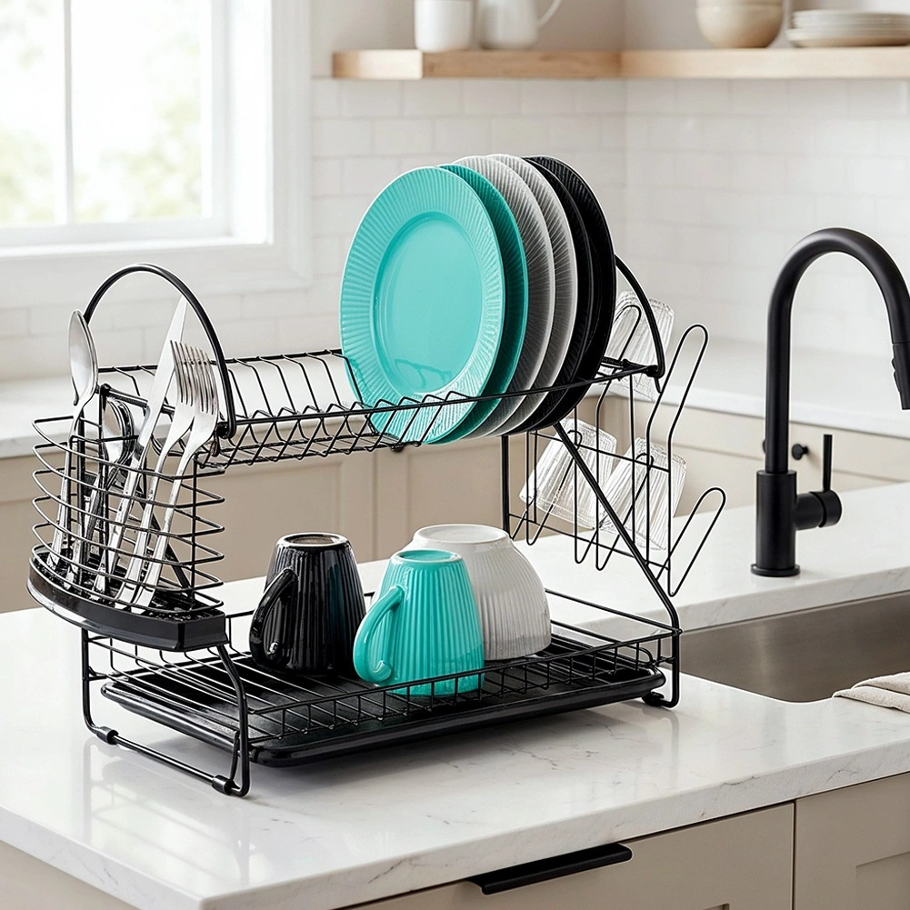 Maksimizirajte prostor ob pomivalnem koritu z odcejalnikom, ki združuje dve ravni sušenja, pametne dodatke in sodoben industrijski videz. Robustna kovinska konstrukcija v mat črni barvi skupaj z odstranljivim plastičnim pladnjem ujame kapljice in zaščiti kuhinjski pult pred vlago.
