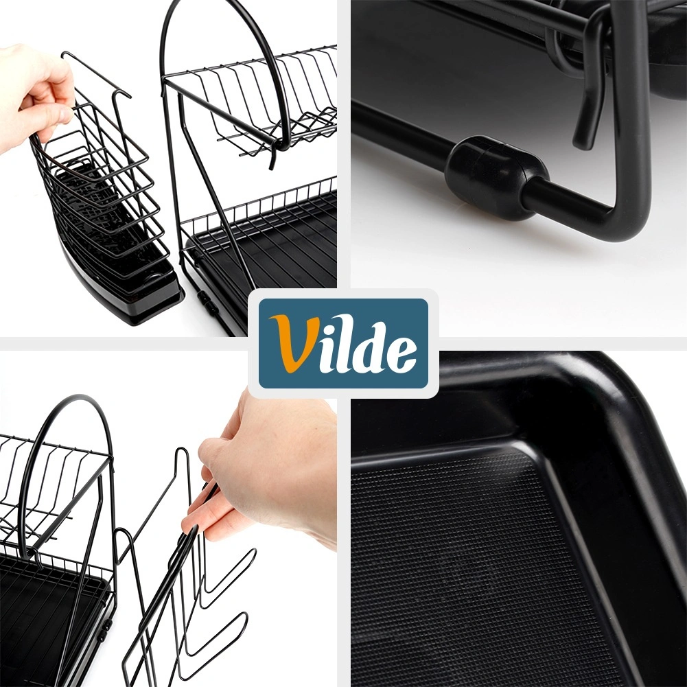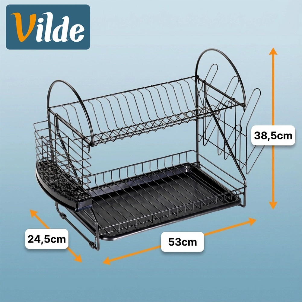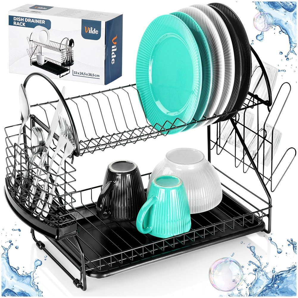 Praktičen dvonivojski odcejalnik za posodo v elegantni črni barvi olajša vsakodnevno pomivanje in sušenje. Ponuja zgornje stojalo za krožnike, spodnjo površino za sklede in kozarce, odstranljiv košarico za pribor in stranski nosilec za deske. Zahvaljujoč veliki kapaciteti in odcejalnemu pladnju bo vaša kuhinja ostala čista in organizirana.