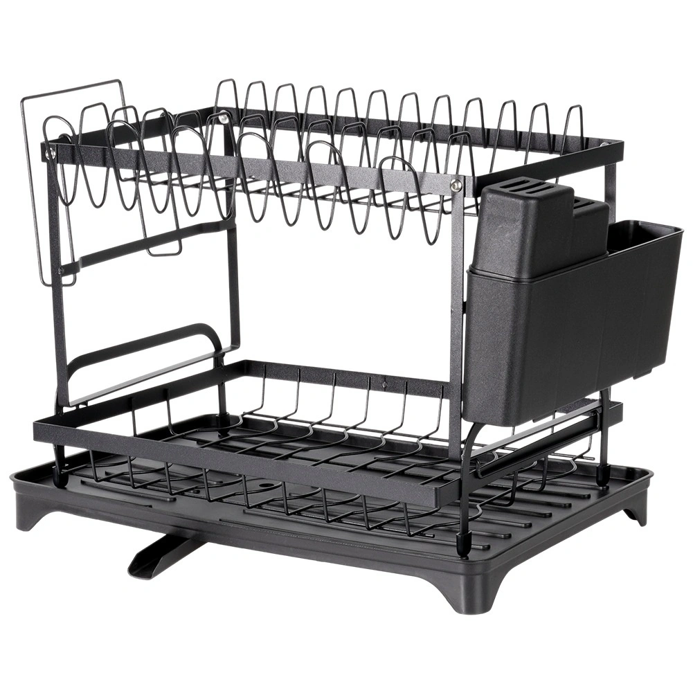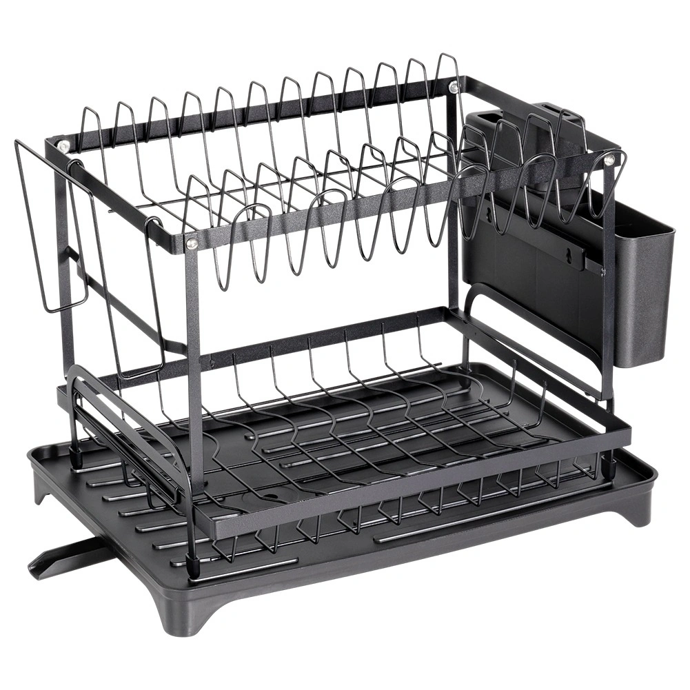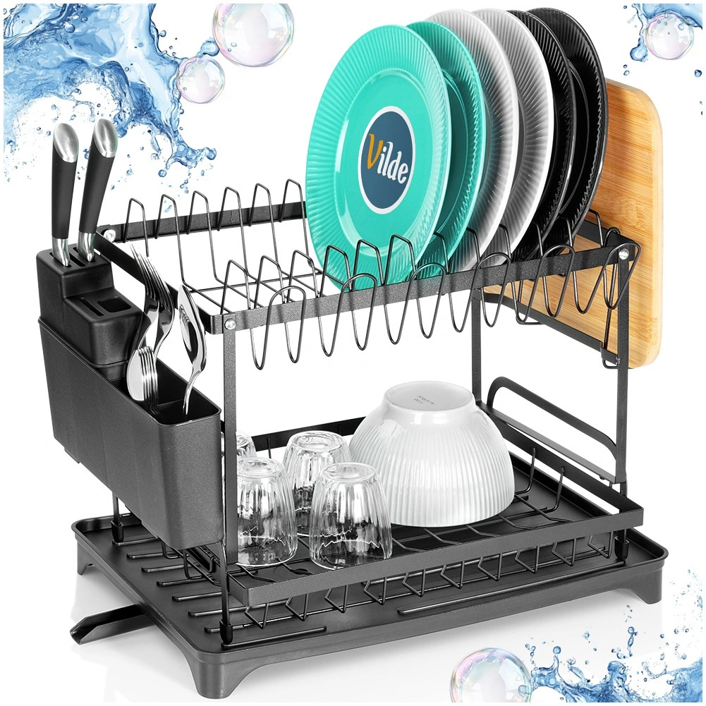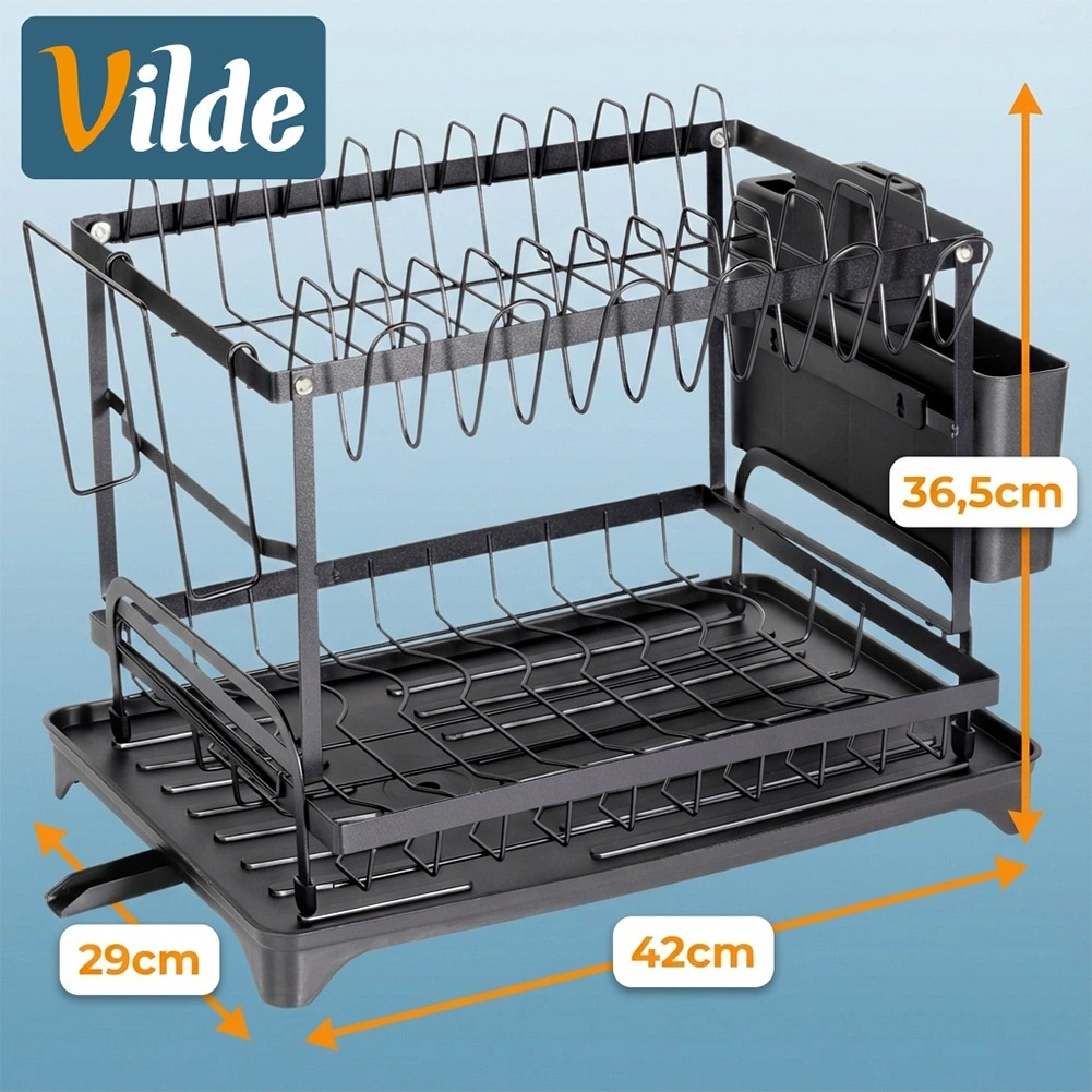 Praktičen dvonadstropni odcejalnik za posodo z merami 42 × 29 × 36,5 cm zagotavlja hitro in pregledno sušenje krožnikov, kozarcev in pribora. Ima trdno kovinsko konstrukcijo v mat črni barvi, odstranljiv pribornik s štirimi predelki in držalo za desko. Pladenj z izlivalom odvaja vodo nazaj v pomivalno korito, zato bo kuhinjski pult ostal suh. Idealno za prihranek prostora in organizirano sušenje v vsaki kuhinji.