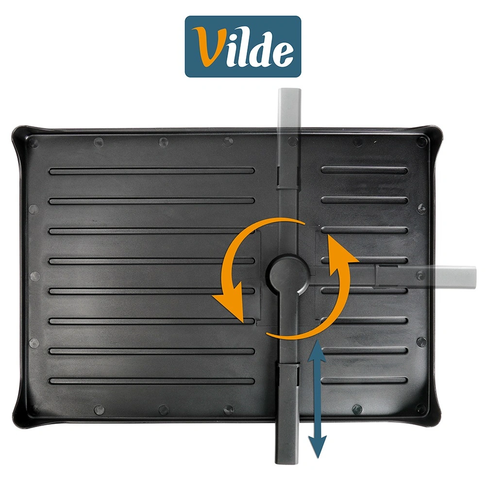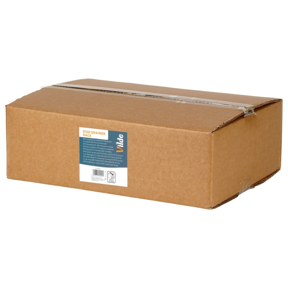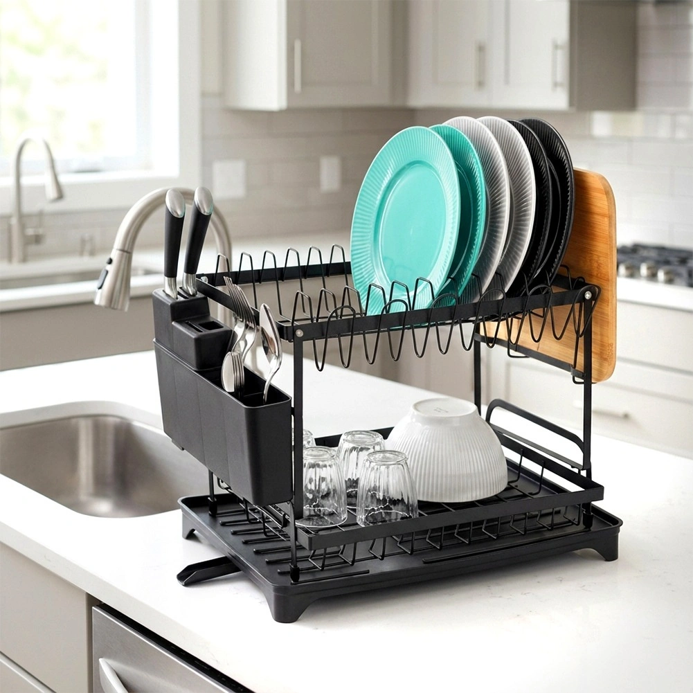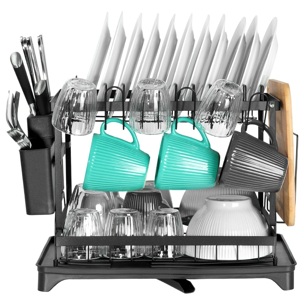 Praktičen dvonadstropni odcejalnik za posodo z merami 42 × 29 × 36,5 cm zagotavlja hitro in pregledno sušenje krožnikov, kozarcev in pribora. Ima trdno kovinsko konstrukcijo v mat črni barvi, odstranljiv pribornik s štirimi predelki in držalo za desko. Pladenj z izlivalom odvaja vodo nazaj v pomivalno korito, zato bo kuhinjski pult ostal suh. Idealno za prihranek prostora in organizirano sušenje v vsaki kuhinji.