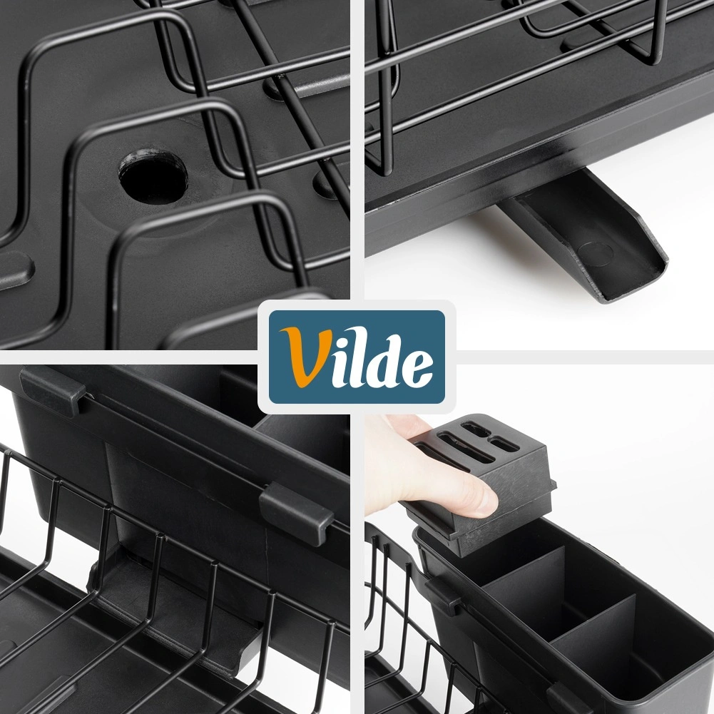Odcejalno stojalo za posodo združuje funkcionalnost in eleganten dizajn. Robusten žičnat okvir iz nerjaveče kovine v črni barvi ter kakovostna plastična odcejalna posoda se zlahka čistita in dolgo trajata. Zaradi premišljene razporeditve sprejme krožnike, kozarce in sklede, trikomorna košarica pa ohranja pribor lepo ločen.