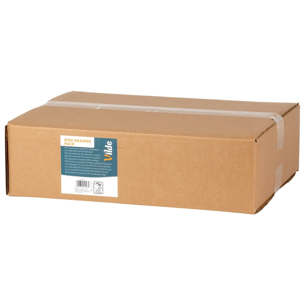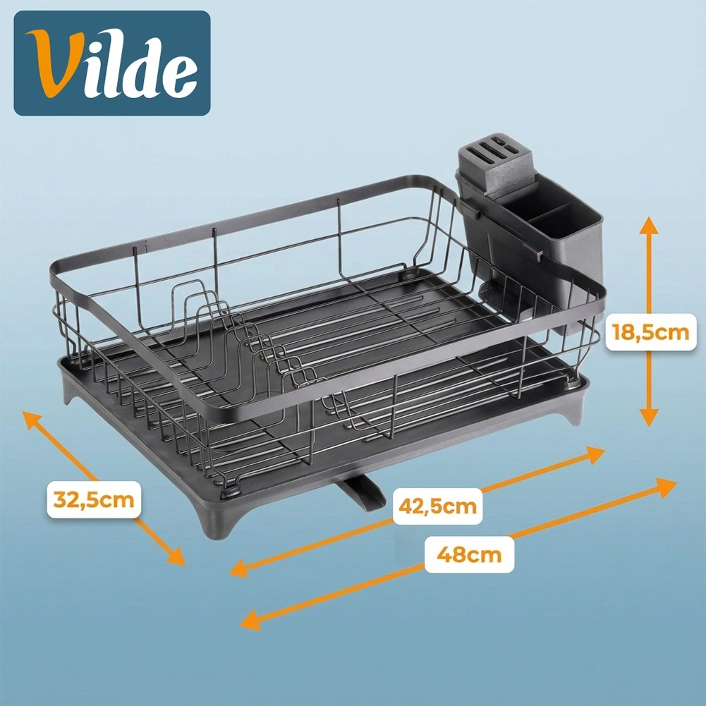 Vgrajeni izlivalnik v posodi omogoča nadzorovan odtok vode neposredno v korito, zato delovna površina ostane brez mokrih sledi. Stojalo se poda v vsako kuhinjo – od moderne do klasične – in zaradi enostavnega vzdrževanja vsak dan prihrani čas. Originalen izdelek znamke VILDE, izdelan v skladu z evropskimi standardi.