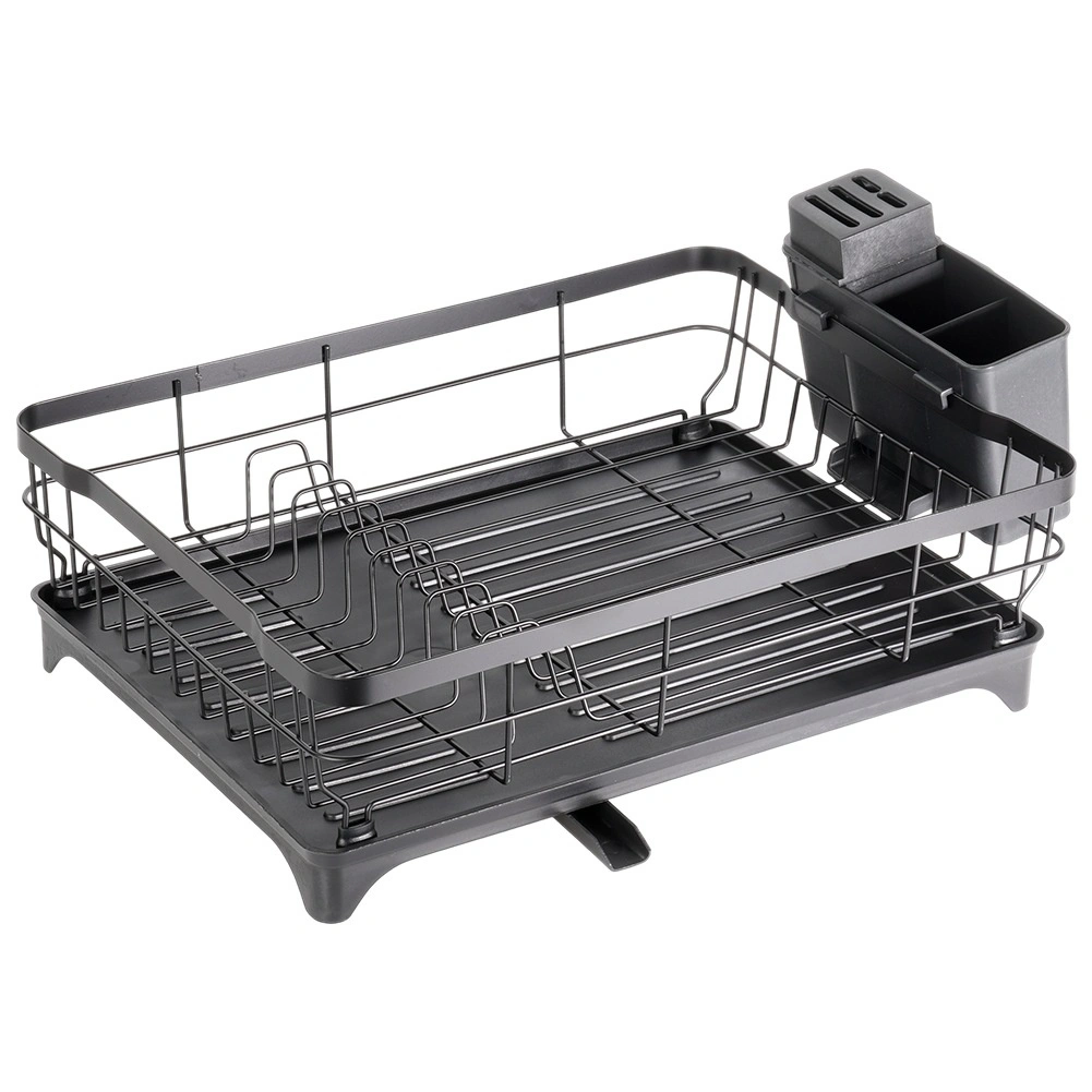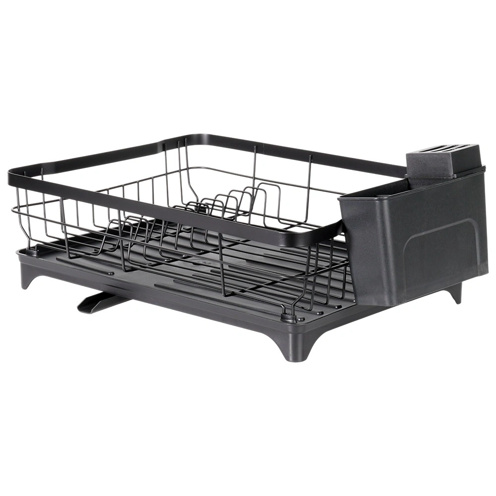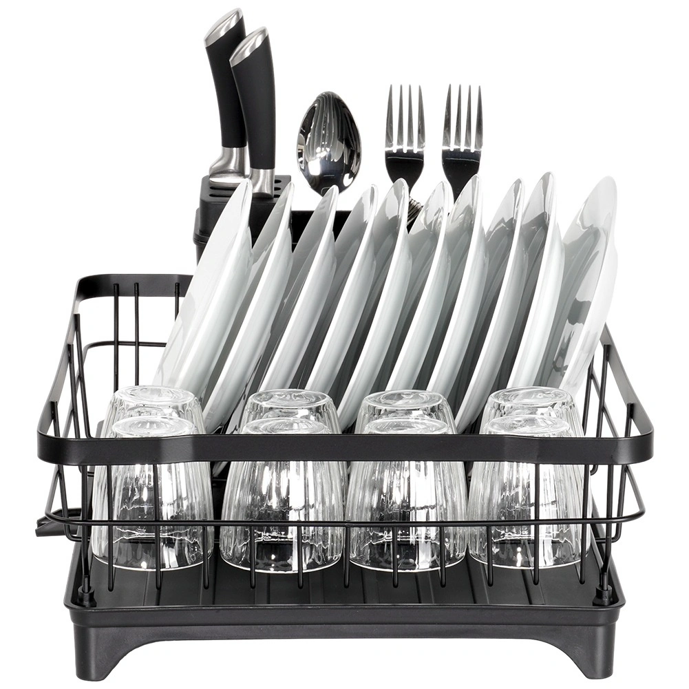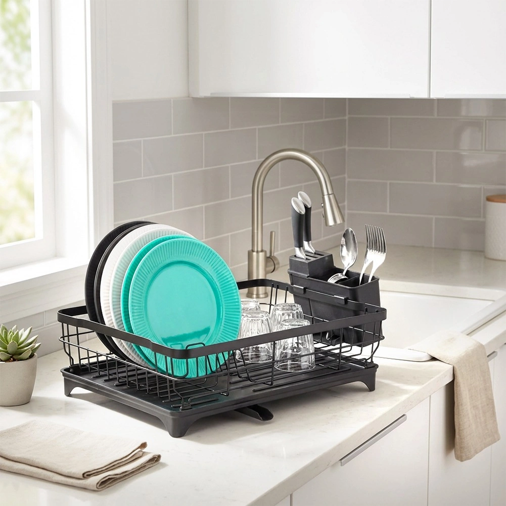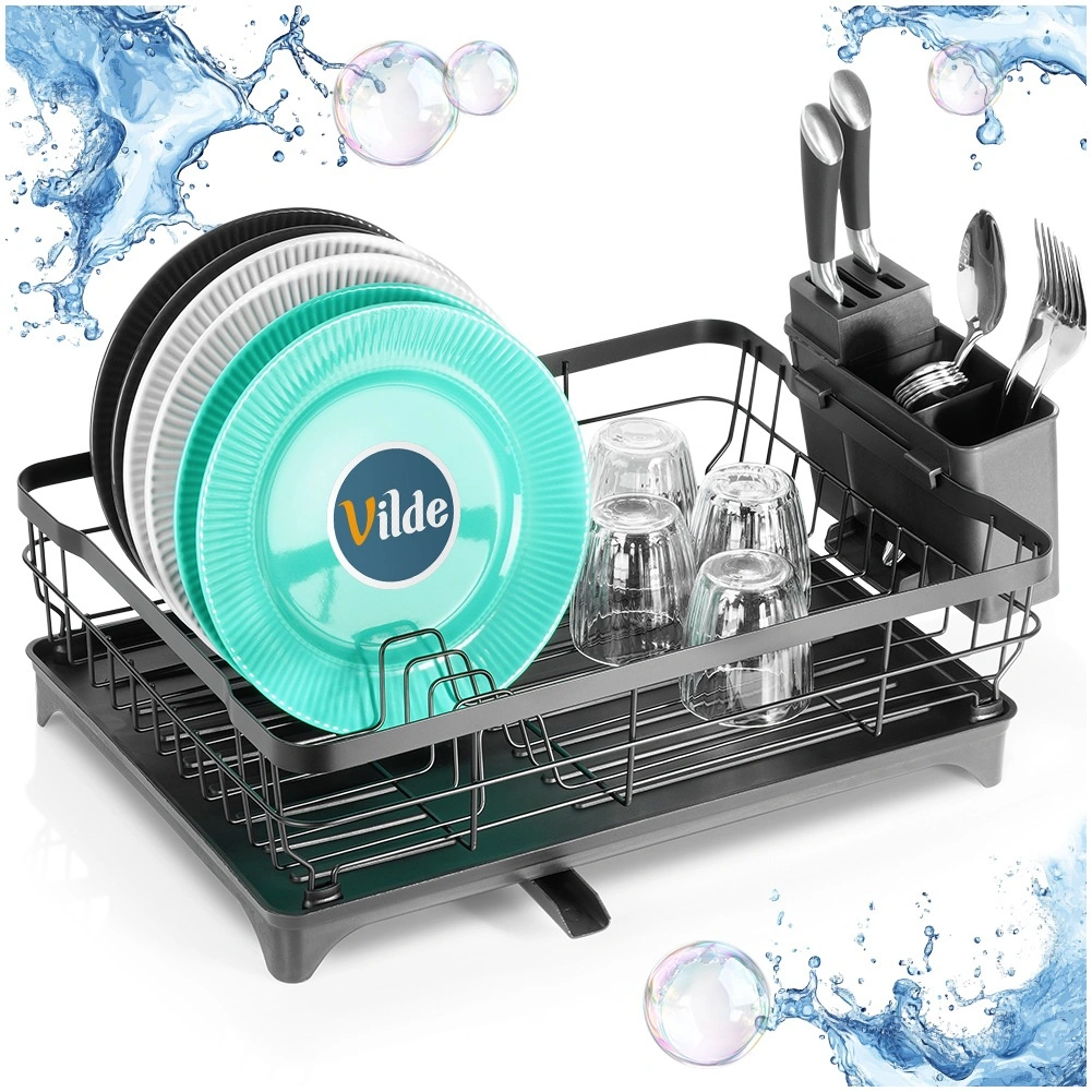 - Kuhinjsko odcejalno stojalo za posodo s posodo in košarico za jedilni pribor