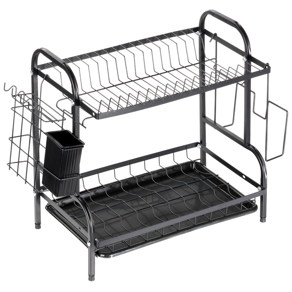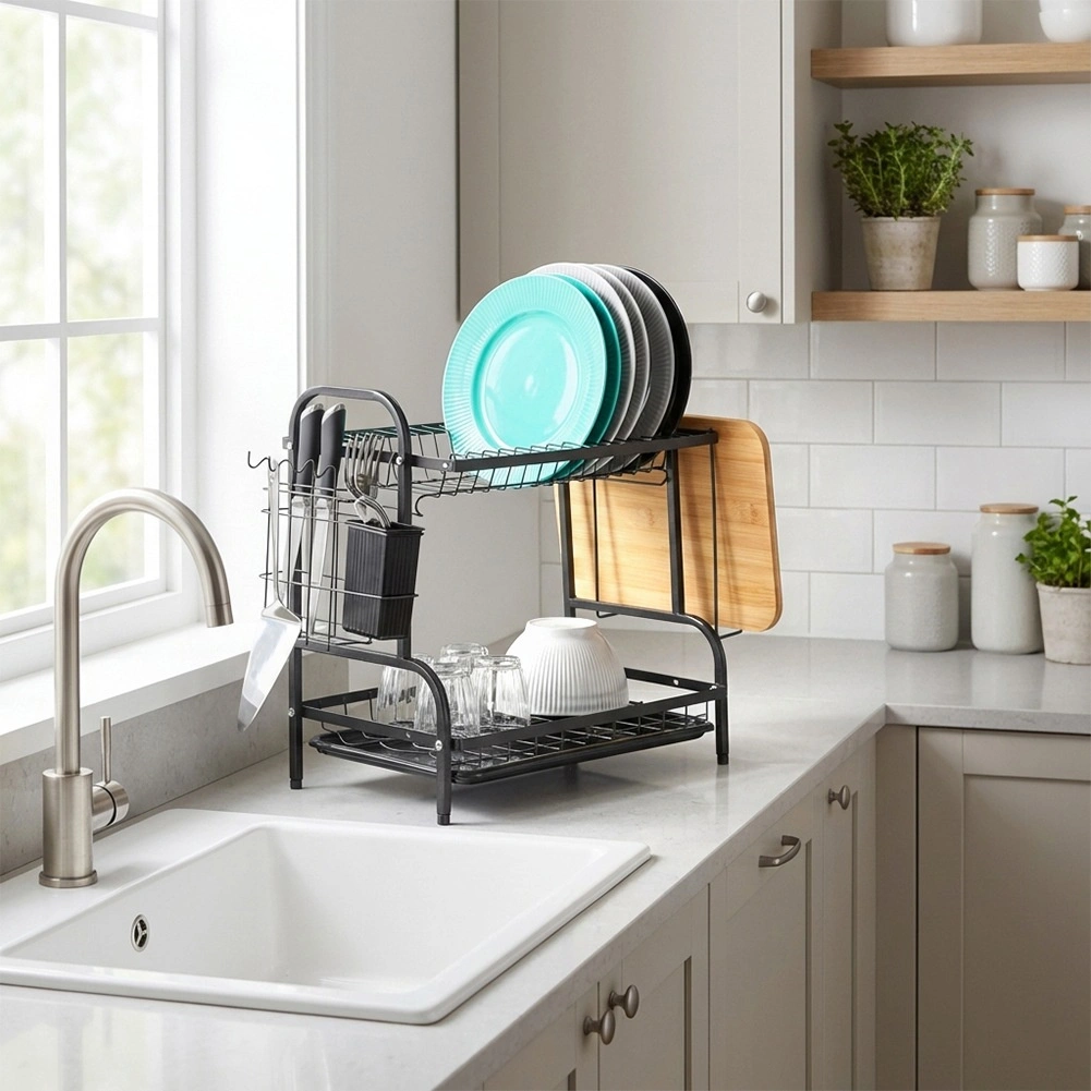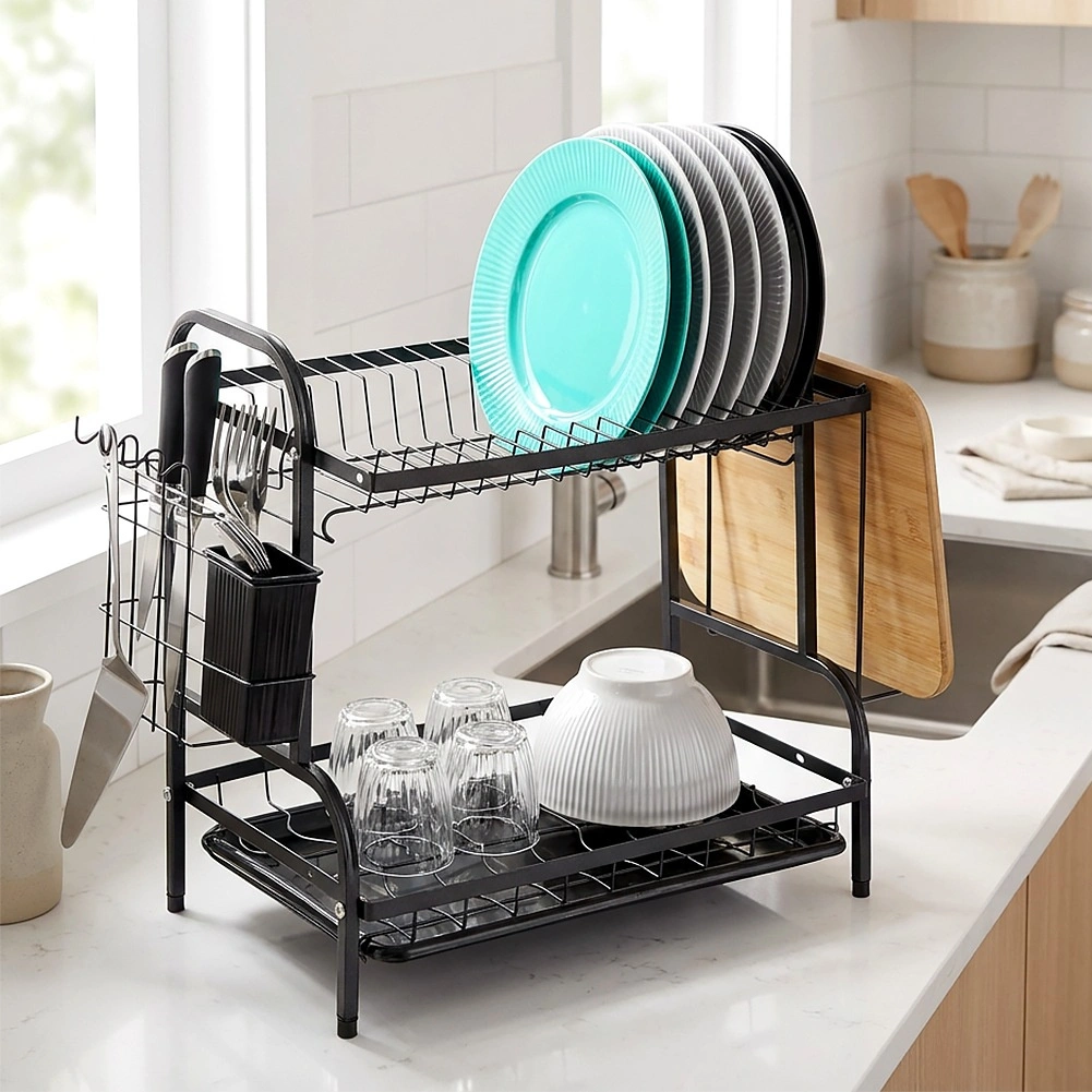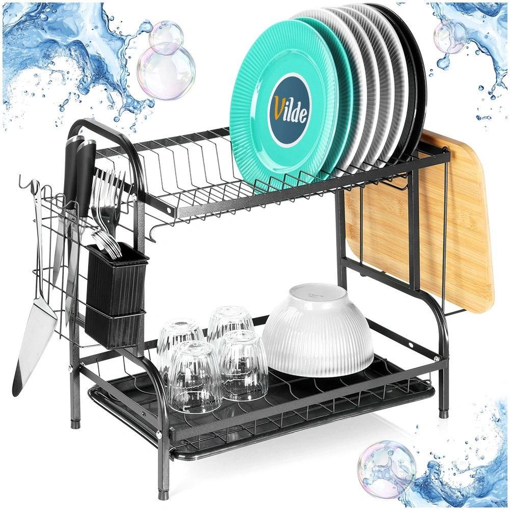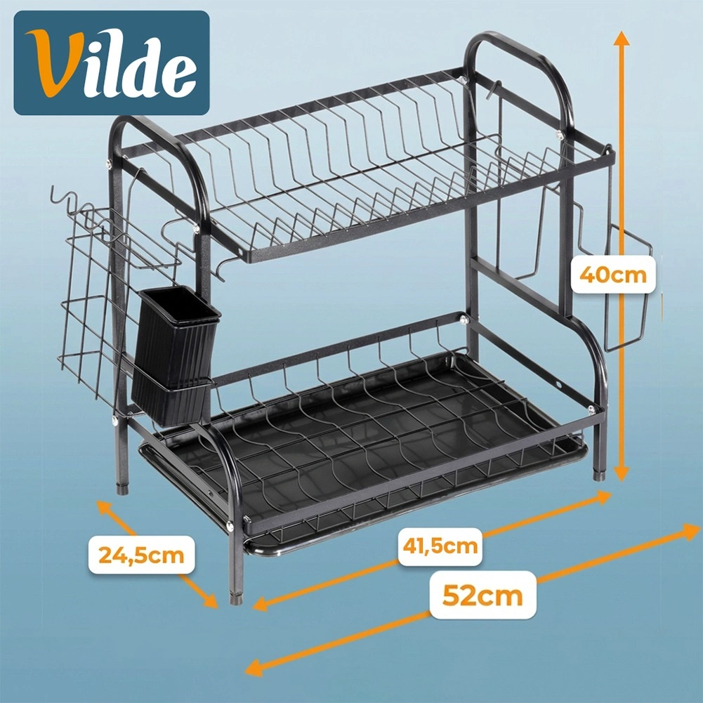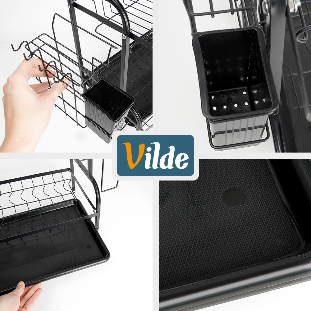 Robustna kovinska konstrukcija v mat črni izvedbi je odporna in nezahtevna za vzdrževanje. Spodnji odcejalni pladenj iz plastike zajema vodo in ščiti kuhinjski pult pred madeži. Celotna rešitev je idealna za manjše kuhinje in gospodinjstva, ki želijo imeti posodo vedno pregledno organizirano.