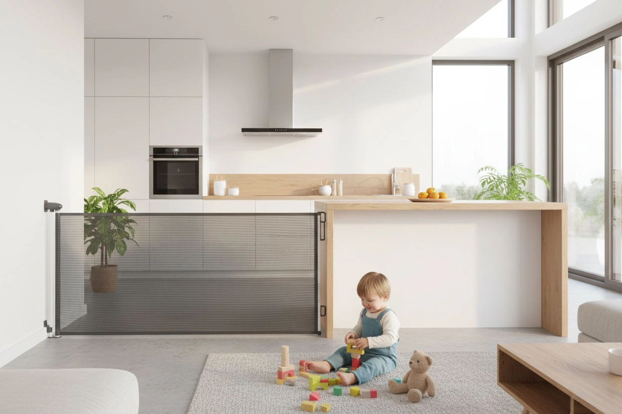 Vlečna ograja ECOTOYS je zanesljiva rešitev za zaporo dostopa do stopnišč, kuhinje ali tehničnih prostorov. Gosto tkana PVC mreža omogoča dobro vidnost in pretok zraka, hkrati pa tvori trdno fizično pregrado za malčke in domače živali.