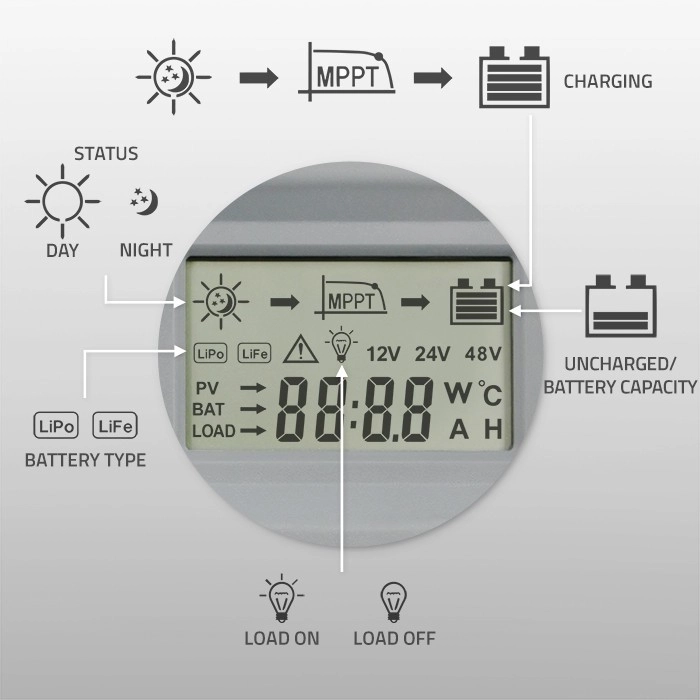 Regulator uporablja napredno MPPT sledenje maksimalne točke moči, ki sproti optimizira napetost in tok iz panelov za najvišjo učinkovitost tudi v spremenljivih pogojih, kot je delna zasenčenost. Zaradi podpore 12 V/24 V in toka do 40 A zanesljivo poganja sisteme na vikendih, čolnih in v avtodomih ter zagotavlja hitro in varno polnjenje.