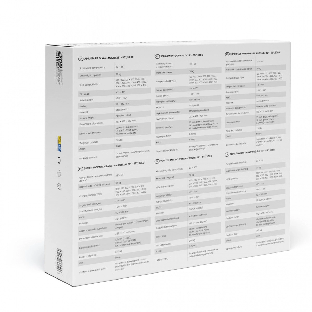 Univerzalen nosilec za televizorje z diagonalo 23–55" z močno jekleno konstrukcijo in nosilnostjo 30 kg. Ponuja popolno nastavitev: nagib +3° do -10°, zasuk do 90° na obe strani in izvlek 60–382 mm. Združljiv s standardom VESA 100×100 do 400×400 za hitro in varno montažo.