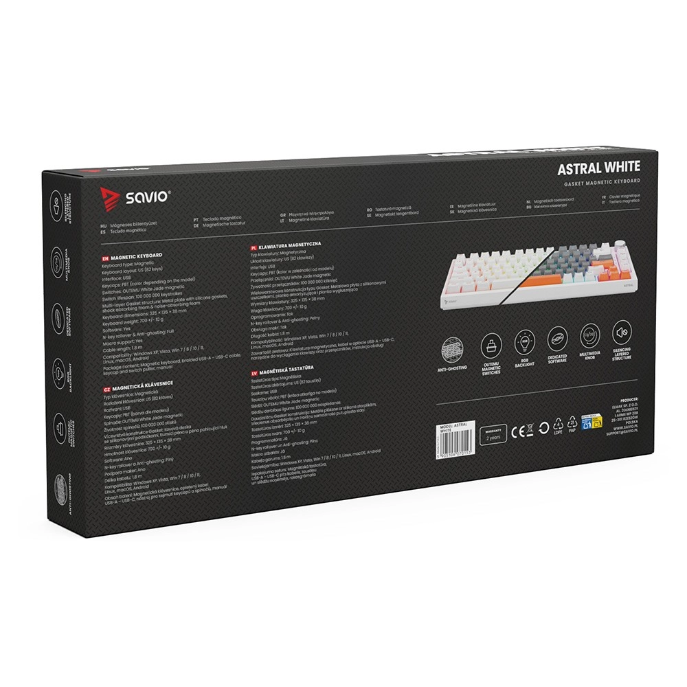 ASTRAL White dvigne izkušnjo tipkanja in igranja z brez kontaktnimi magnetnimi stikali OUTEMU White Jade s Hallovim senzorjem. Prinašajo hitrejši odziv, gladek linearen hod in izjemno življenjsko dobo do 100.000.000 pritiskov. Kompaktna postavitev z 82 tipkami prihrani prostor na mizi in nudi več prostora za miško, ne da bi izgubili pomembne funkcije.