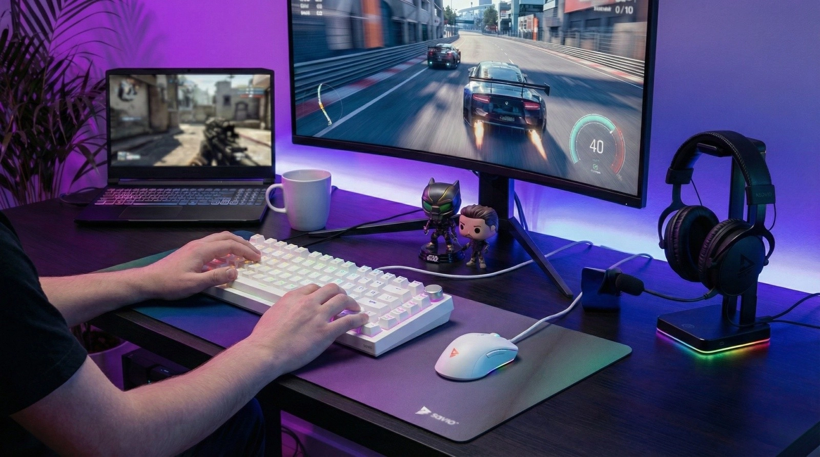 Popolnoma programabilen RGB z več kot 16 milijoni barv in priročno vrtljivo kolesce za hitro nastavitev glasnosti brez prekinjanja igre.