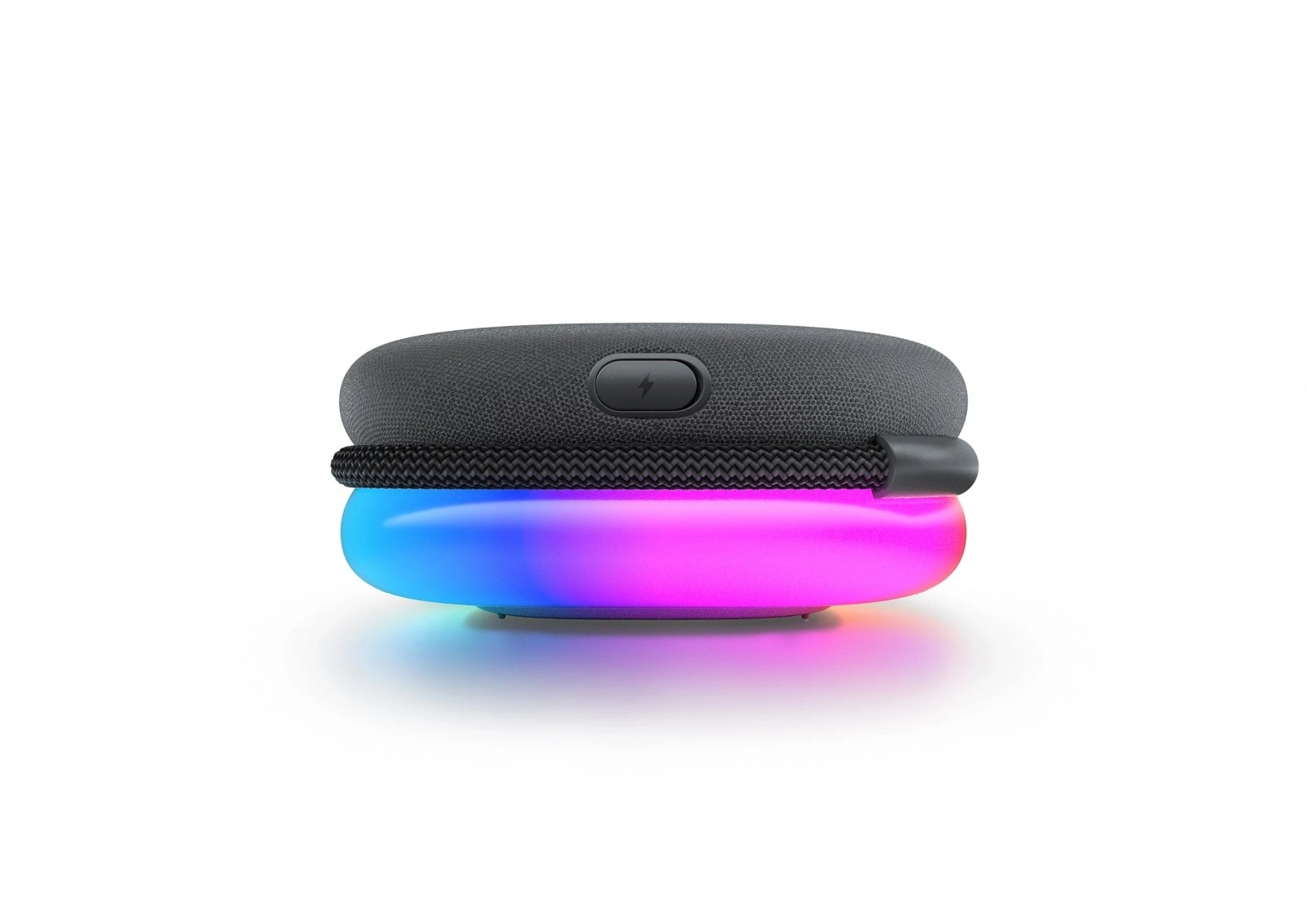 Kompakten brezžični zvočnik s tekstilno površino in RGB osvetlitvijo spremeni vsak prostor v glasbeno sceno. Uživajte v izraženih basih zahvaljujoč pasivnemu radiatorju, do 7 ur predvajanja, Bluetooth pretakanju s telefona in 3 načini osvetlitve od party barv do nežne nočne svetlobe. Praktična zanka olajša prenašanje.