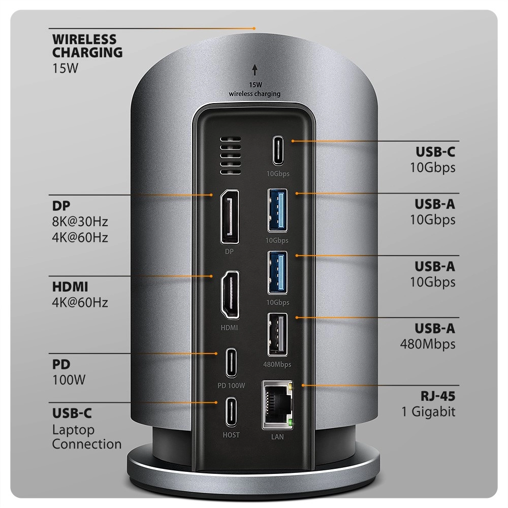 - 9v1 razširitev: DP, HDMI, 3× USB (10 Gb/s), 1× USB (480 Mb/s), USB-C PD vhod, RJ-45, brezžično polnjenje 15 W
