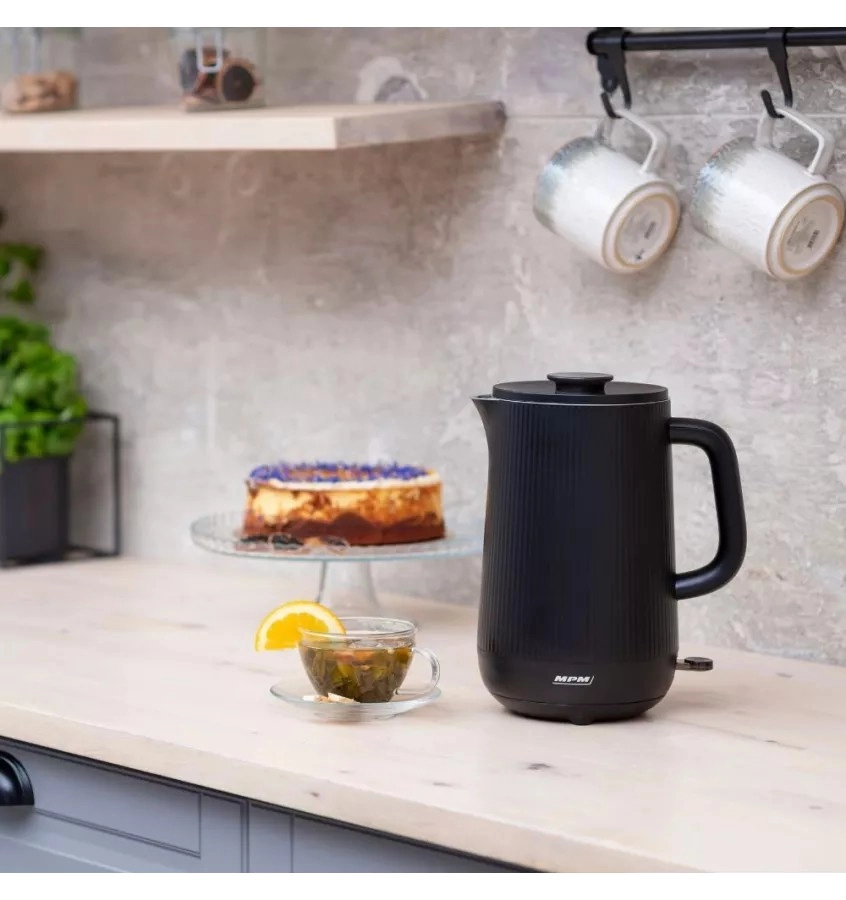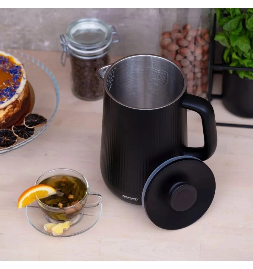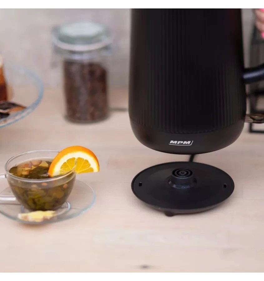 Stilen brezžični grelnik z dvojno steno ohrani vodo dlje vročo in zagotavlja tiho delovanje. Notranja nerjavna posoda brez spojov varuje naravni okus napitkov, medtem ko se negrejoče ohišje iz rebraste plastike na dotik ne segreje in ponuja nedrseč oprijem. Idealno za vsakodnevno pripravo čaja, kave in zeliščnih poparkov.