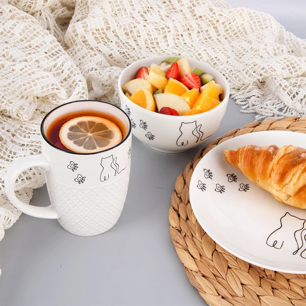 Nežna črno-bela ilustracija mačke in tačk skodelici doda izviren značaj in se zlahka ujema z drugim posodjem.