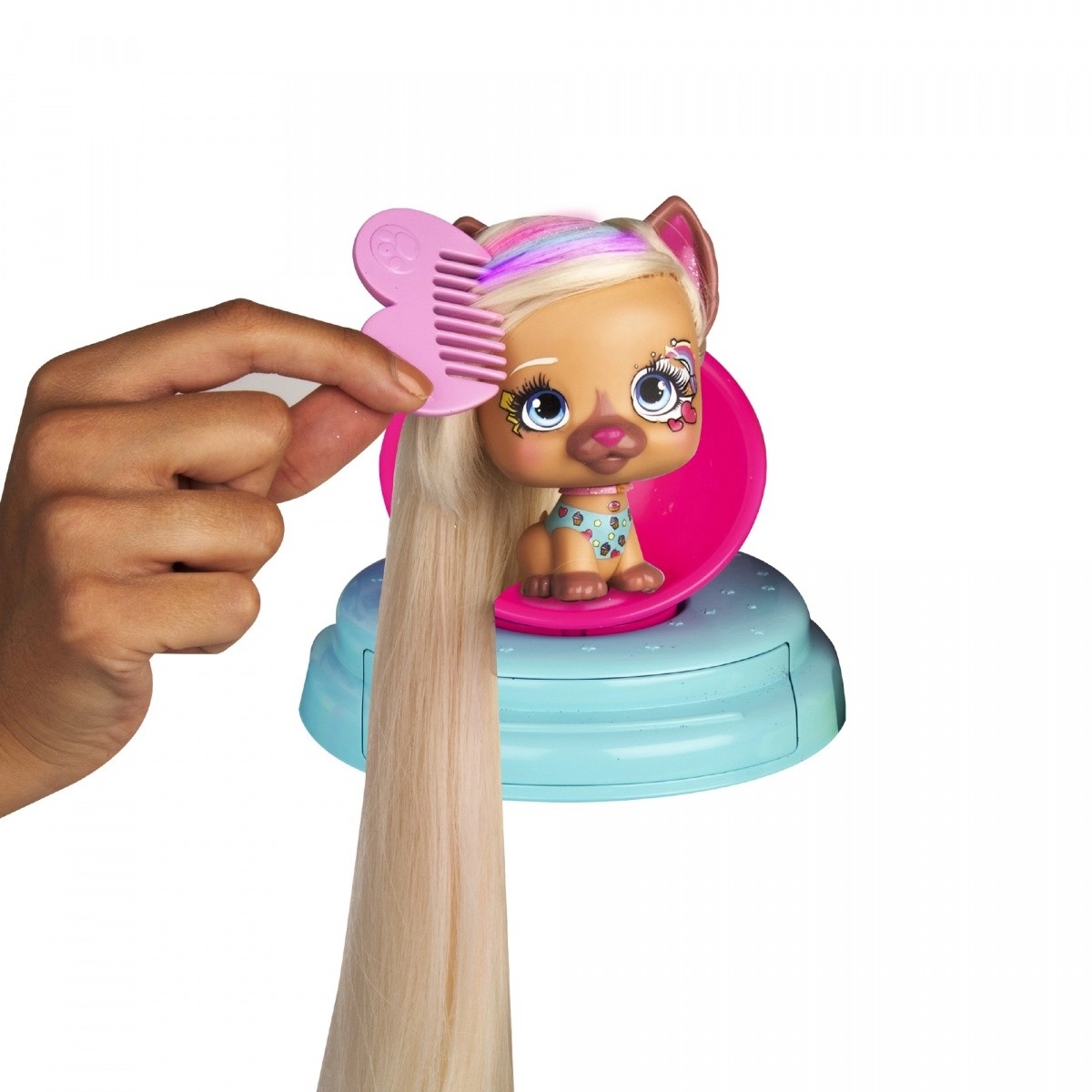 Ustvarite doma svoj frizerski studio z VIP Pets frizerskim salonom in prikupno psičko Kiarro z izjemno dolgimi 30 cm lasmi. Češite, spletajte, barvajte in krasite z bleščicami – zahvaljujoč pravi umivalnici, bleščičnemu komorčku in bogatemu setu 15 dodatkov nastanejo deseci izvirnih pričesk. Varne, netoksične barve, kakovostna izdelava in barvni učinki zagotavljajo ure ustvarjalne zabave za otroke od 3 let dalje.