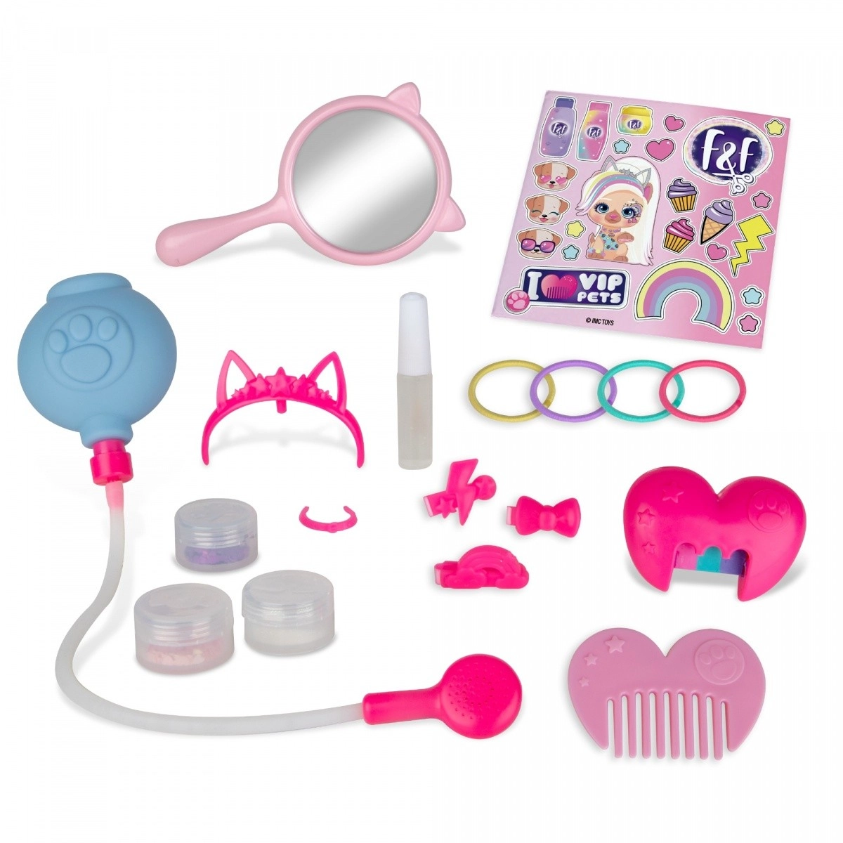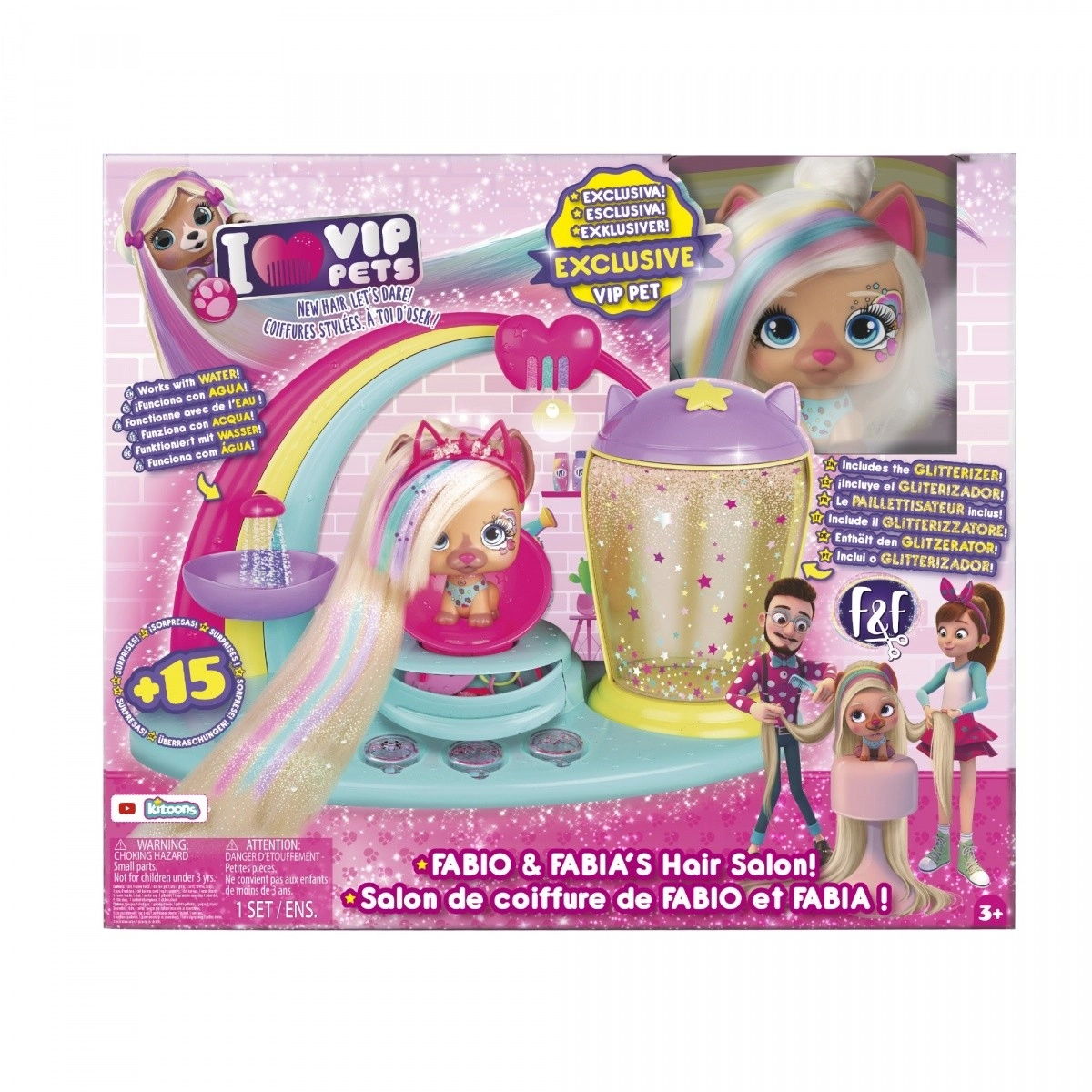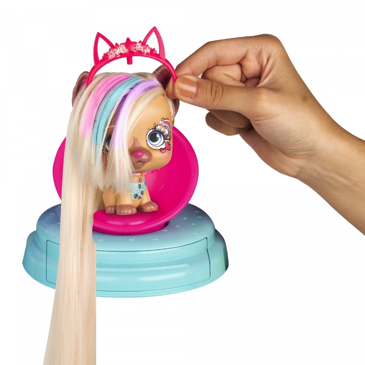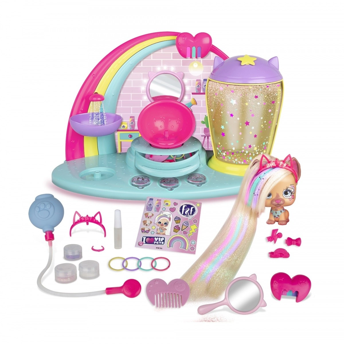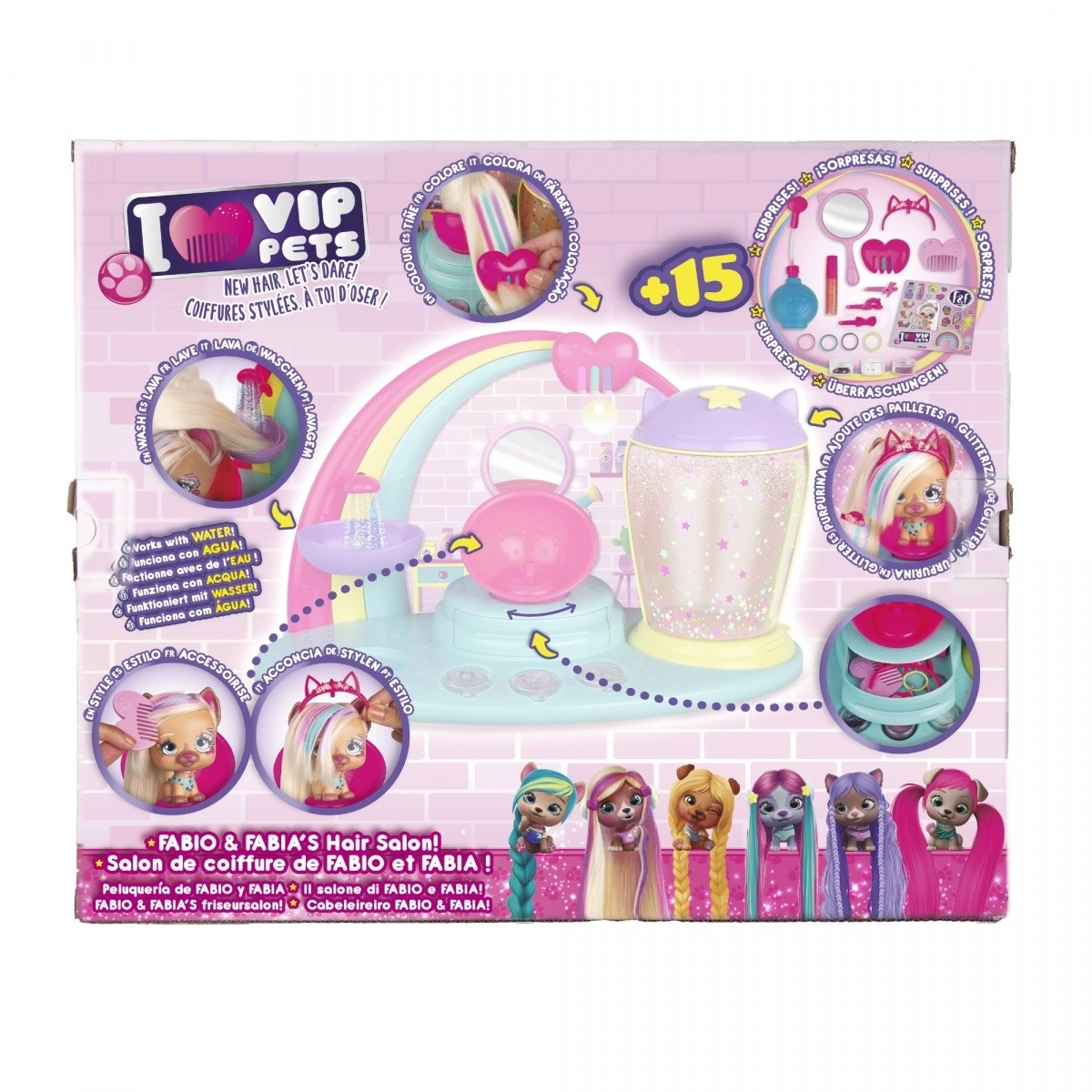 Salon VIP Pets prinaša vzdušje priljubljene serije naravnost v otroško sobo. Glavna zvezda je psička Kiara s platinasto svetlimi, 30 cm dolgimi lasmi, ki jih lahko umivate, barvate, češete, spletate in krasite. Zahvaljujoč funkcionalni frizerski umivalnici lase preprosto navlažite, z mavričnim glavnikom pa ustvarite barvne pramene. V bleščični kapsuli pričeski dodate očarljiv glitter učinek.