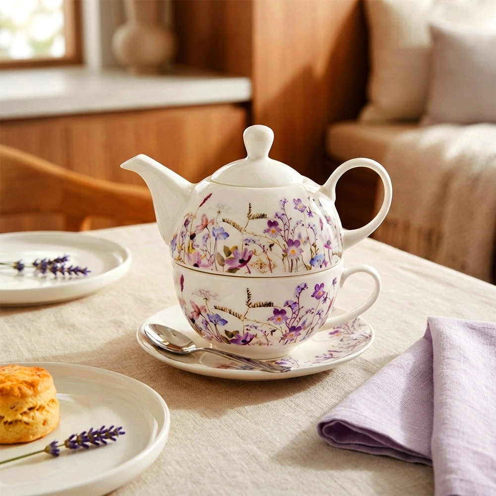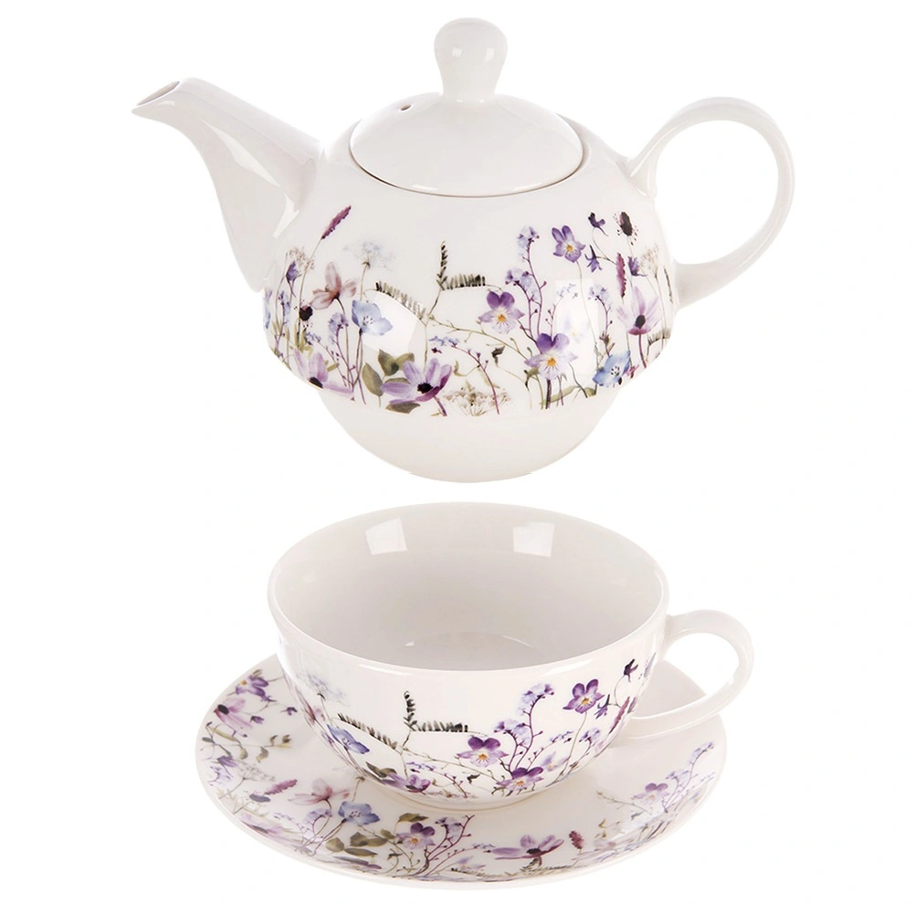 Ta porcelanasti set za čaj za eno osebo je zasnovan za maksimalno udobje in slog. Čajnik lahko odložite neposredno na skodelico, kar prihrani prostor in ustvari harmonično celoto. Nežna dekoracija travniških cvetov v odtenkih vijolične in rožnate doda pogrinjku romantičen pridih in se zlahka uskladi z ostalim posodjem.