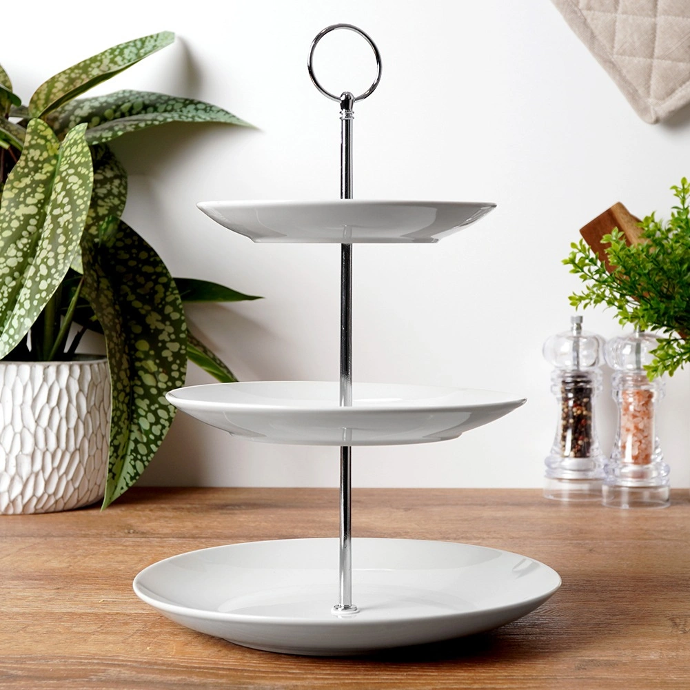 Tri okrogli krožniki s premerom približno 25, 20 in 15 cm nudijo dovolj prostora za sladice, sadje in kanapeje, hkrati pa varčujejo s prostorom na mizi.