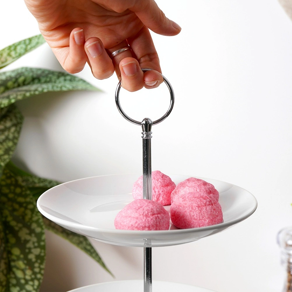 Osrednja kovinska palica s praktičnim obročem omogoča varno in udobno prenašanje celotne etažerke med postajami serviranja.