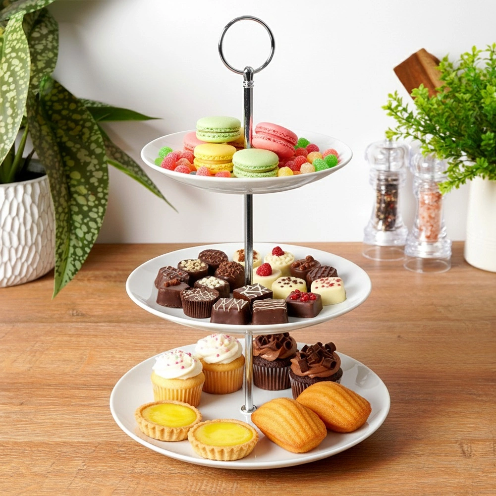Ta bela porcelanasta trietažna etažerka je odlična izbira za sweet bar, domača praznovanja in profesionalni catering. Minimalističen videz poudari izgled serviranih dobrot, naj gre za cupcakes, piškote, makrone, sadje ali kanapeje.