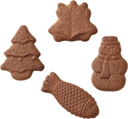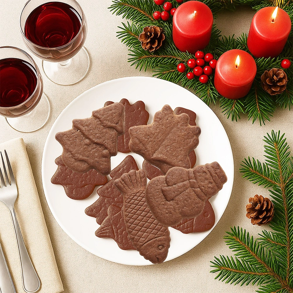 Model ponuja smrečice v dveh velikostih, snežaka, zvončke in ribo – idealno za piškote in čokoladice s prazničnim videzom.