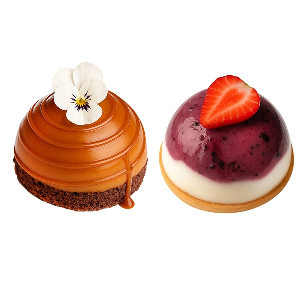 Univerzalna uporaba: od mousse tortic in čokoladic do biskvitnega in maslenega testa. Material je lahek, trpežen in dolgotrajno zanesljiv. Zunanje mere modela so 28 × 16,5 × 3 cm, premer ene polkrogle 6,5 cm.