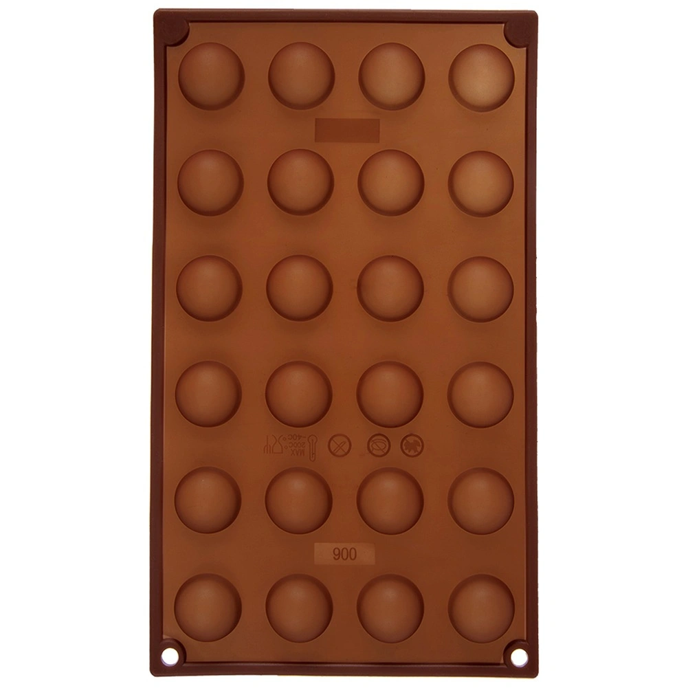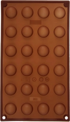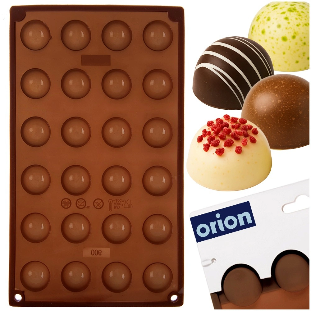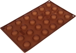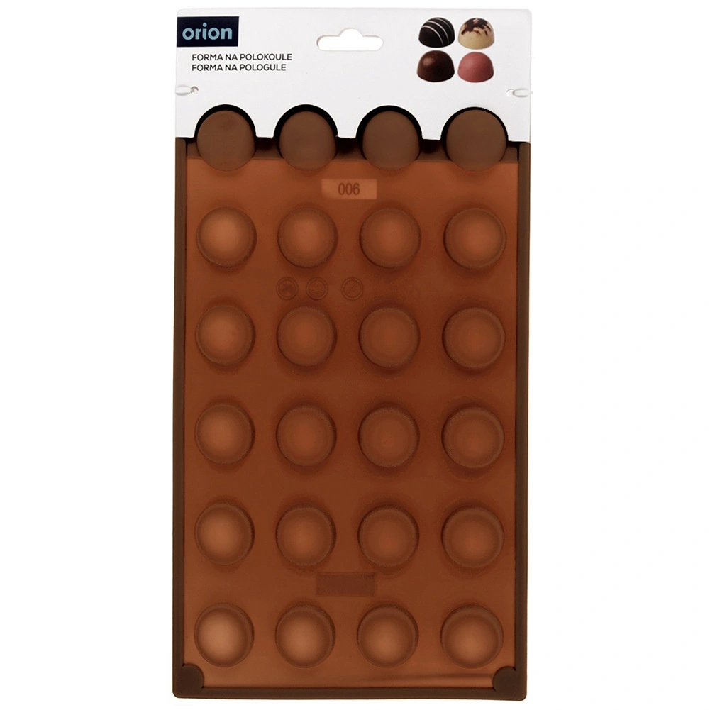 Ta rjav silikonski model z merami 30 × 17,5 × 1,5 cm omogoča pripravo elegantnih polkrožnih pralin, čokoladic ali majhnih sladic s premerom približno 2,8 cm. Zahvaljujoč prožnemu materialu se sladice zlahka izstisnejo in ohranijo popolno obliko brez lepljenja.