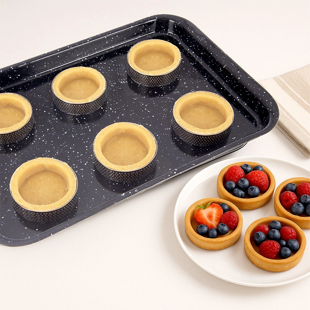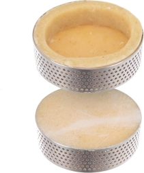 Set nerjavnih obročev za tartelete je idealen za domačo in profesionalno peko. Perforirane stene podpirajo kroženje zraka in odvajanje pare, zato dobite enakomerno pečene in hrustljave korpuse z čistimi robovi. Obroče preprosto položite na papir za peko ali silikonsko podlago – brez potrebe po mazanju.