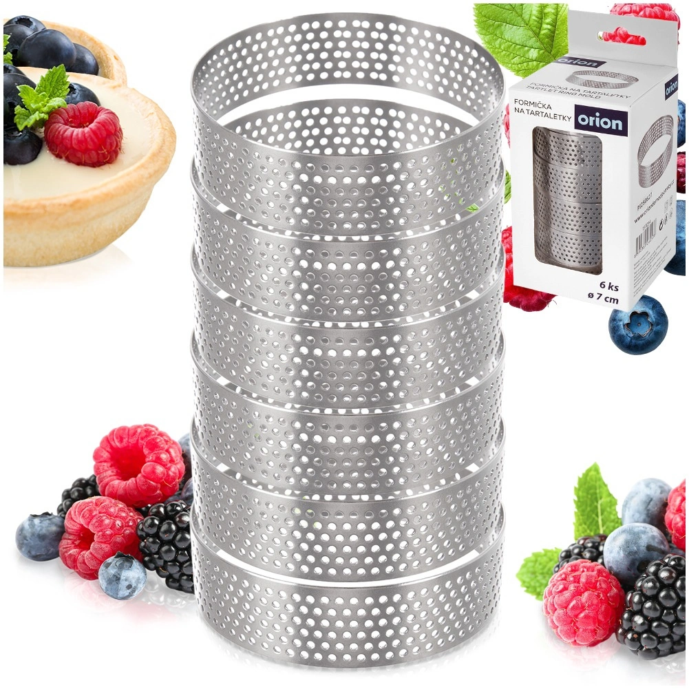 Praktičen set 6 perforiranih obročev za tartelete s premerom 7 cm in višino 2 cm za enakomerno peko, hrustljave korpuse in lahko odstranjevanje brez mazanja. Nerjavno jeklo zagotavlja vzdržljivost in oblikovno stabilnost, perforacija pa omogoča odvod pare in popolno prepečenost sladkih in slanih tartelet. Primerno za pomivalni stroj.