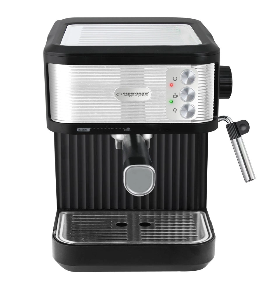 Stilski ročni kavni aparat Esperanza CATURRA s tlakom 20 barov, rezervoarjem 1,8 l in parno šobo za zračno mlečno peno. Ponuja hitro pripravo espressa, ogrevanje skodelic in enostavno čiščenje zahvaljujoč odstranljivemu odcejalnemu pladnju.