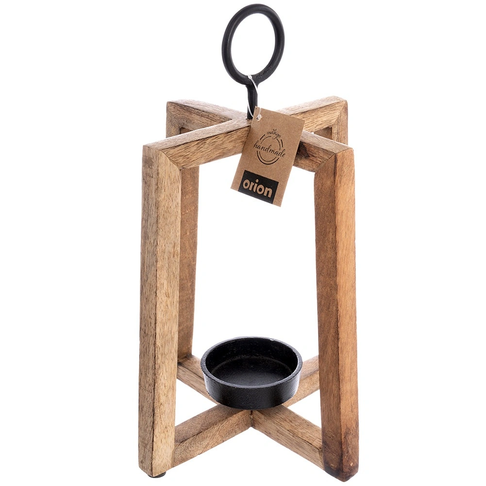 Stilski lesen svečnik iz mangovega lesa z odprto konstrukcijo prinaša prijetno ambientalno svetlobo in doda notranjosti ter terasi naravni šarm. Kovinski nosilec omogoča obešanje in udobno prenašanje, kovinska posodica varno drži svečko/čajno svečko premera do 6 cm, filcaste blazinice pa zagotavljajo stabilnost in zaščito površine. Dimenzije 18 × 18 × 27,5 cm.
