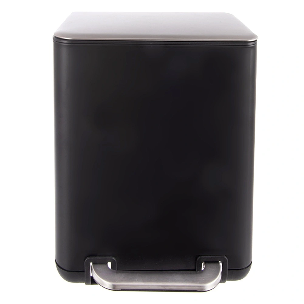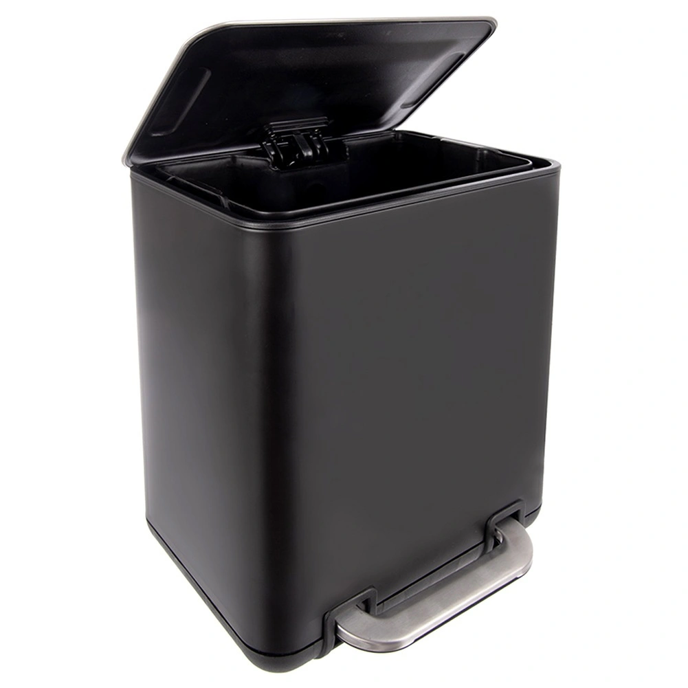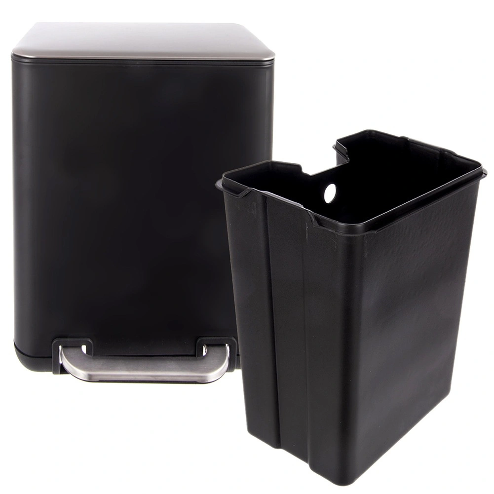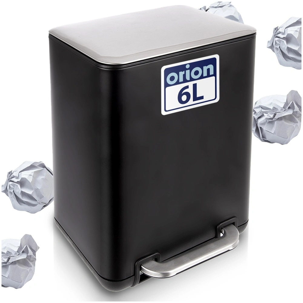 Kompakten pedalni koš za odpadke 6 l iz trpežnega nerjavečega jekla v elegantni črni barvi s srebrnimi detajli ponuja higiensko odpiranje brez rok, odstranljivo notranjo posodo za preprosto čiščenje in vsestransko uporabo v kopalnici, kuhinji ali pisarni.