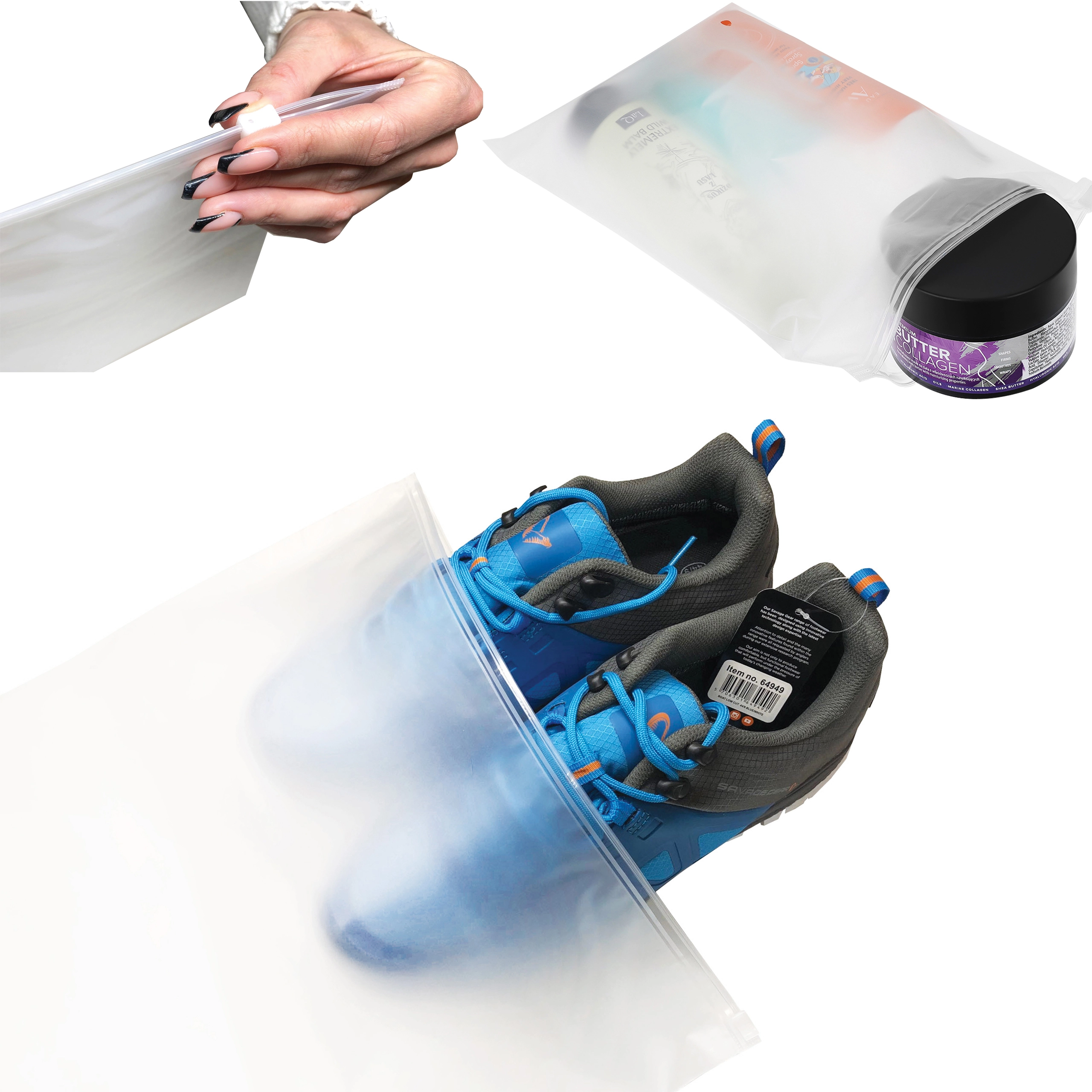 Praktične, večkrat uporabne vrečke z zadrgo v velikosti 250 × 200 mm za pregledno shranjevanje in zaščito predmetov na poti in doma. Ponašajo se z mat, polprosojnim materialom, zanesljivim zapiranjem na zadrgo in vsestransko uporabo od kozmetike do obutve. Pakiranje vsebuje 50 kosov.