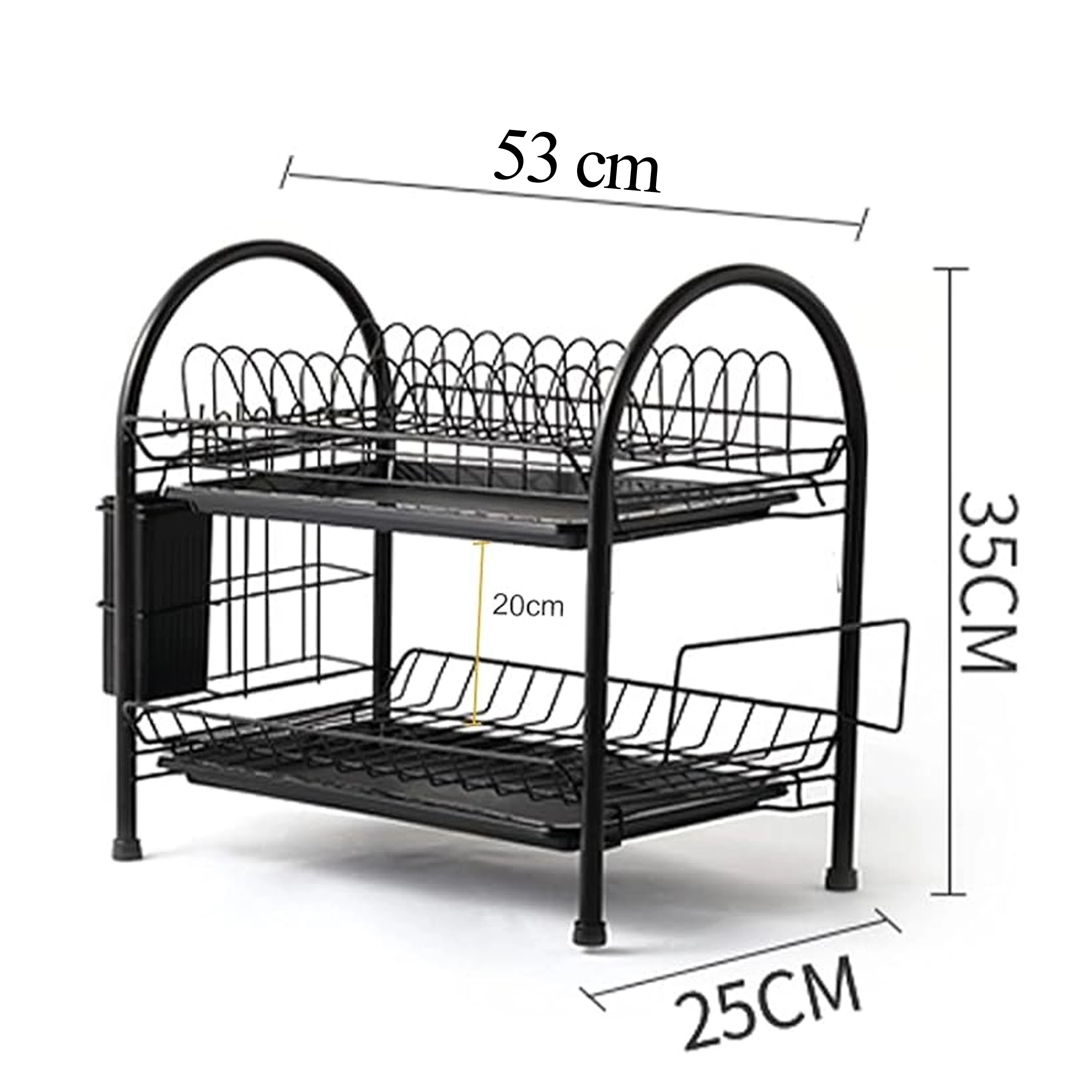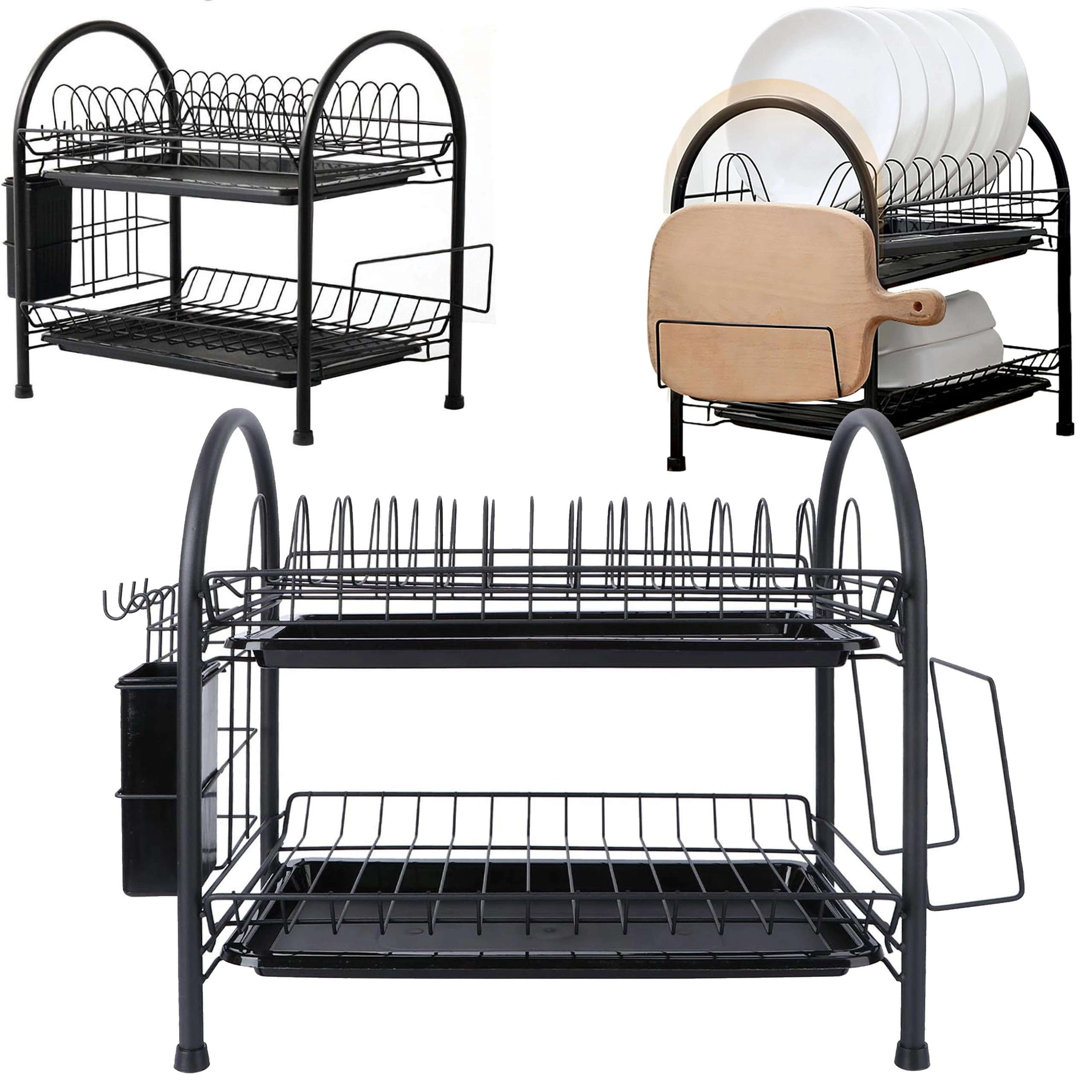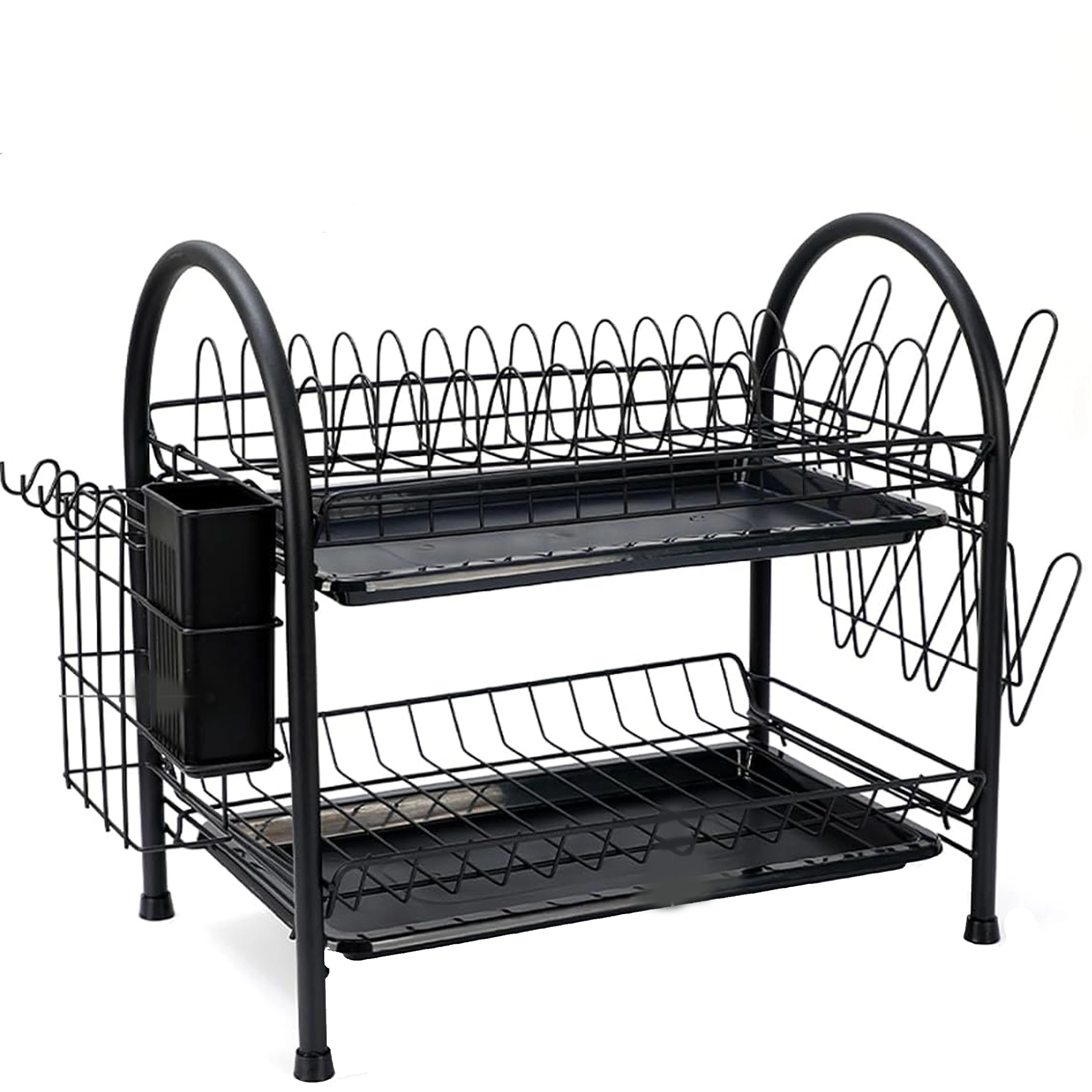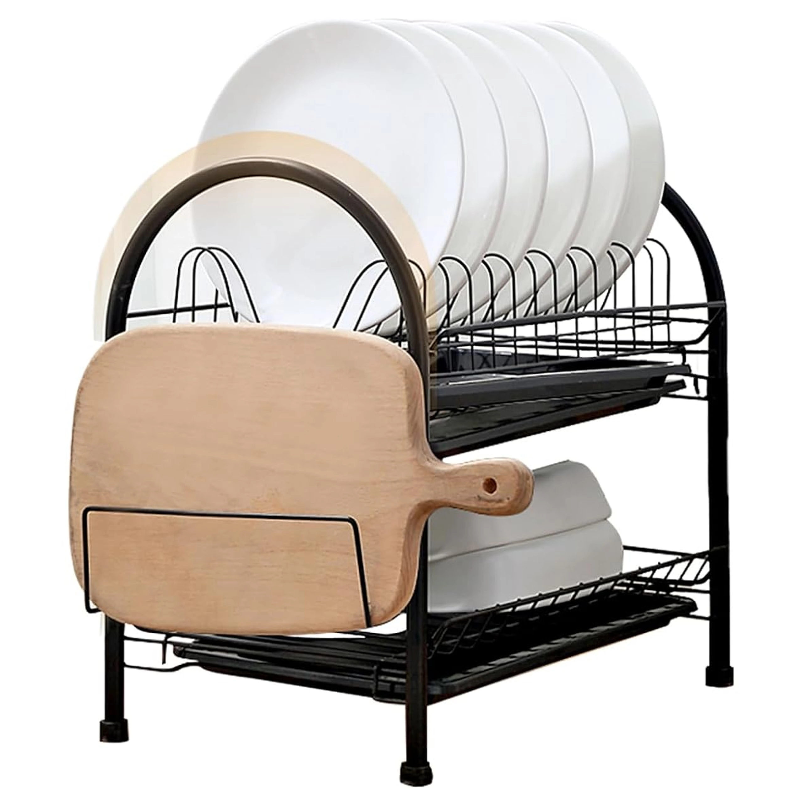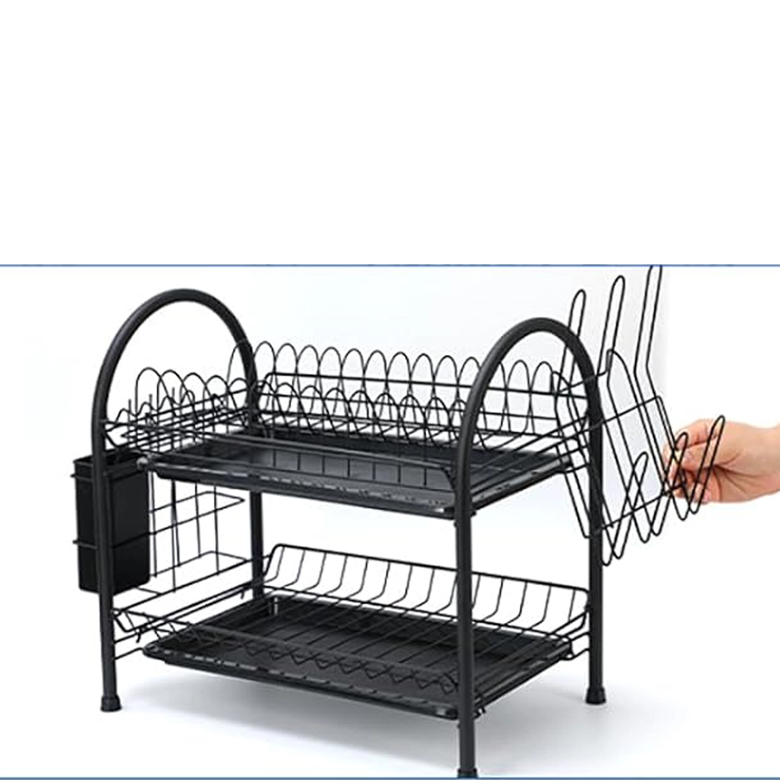 To prostorno dvostopenjsko odcejalno stojalo združuje čvrsto kovinsko konstrukcijo z modernim dizajnom, ki se poda vsaki kuhinji. Zgornja stopnja je idealna za krožnike, spodnja za sklede ali kozarce, stranski nosilci pa sprejmejo pribor in desko za rezanje. Odstranljivi pladnji ujamejo vodo in ohranjajo pult brez kapljic.