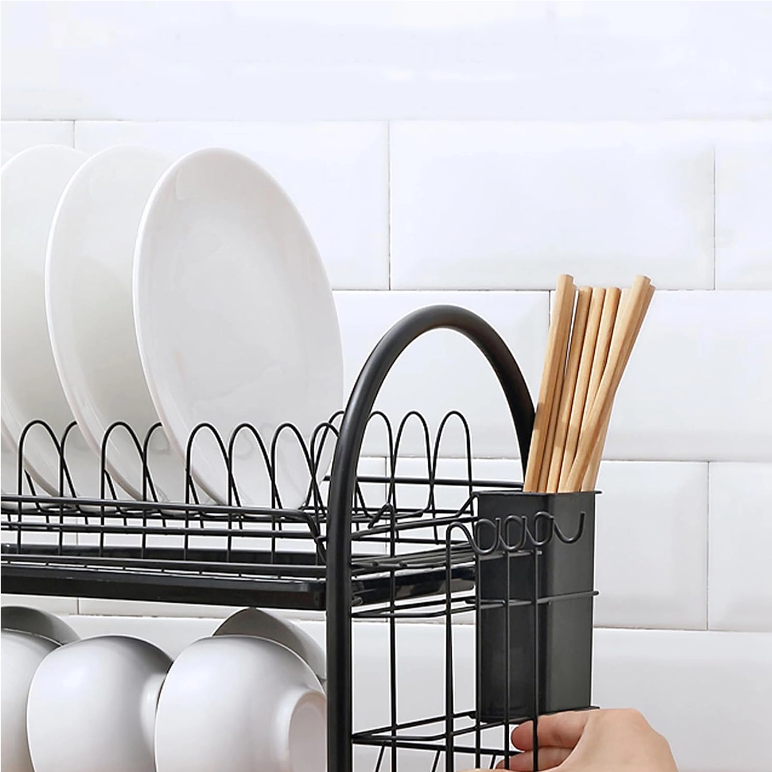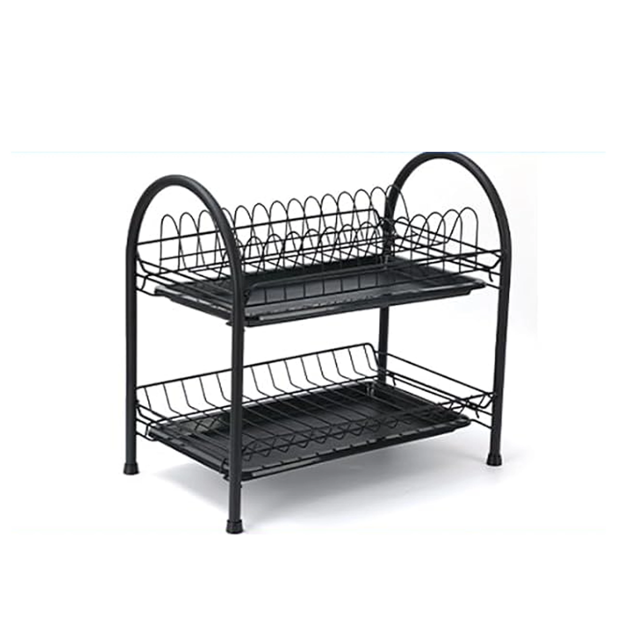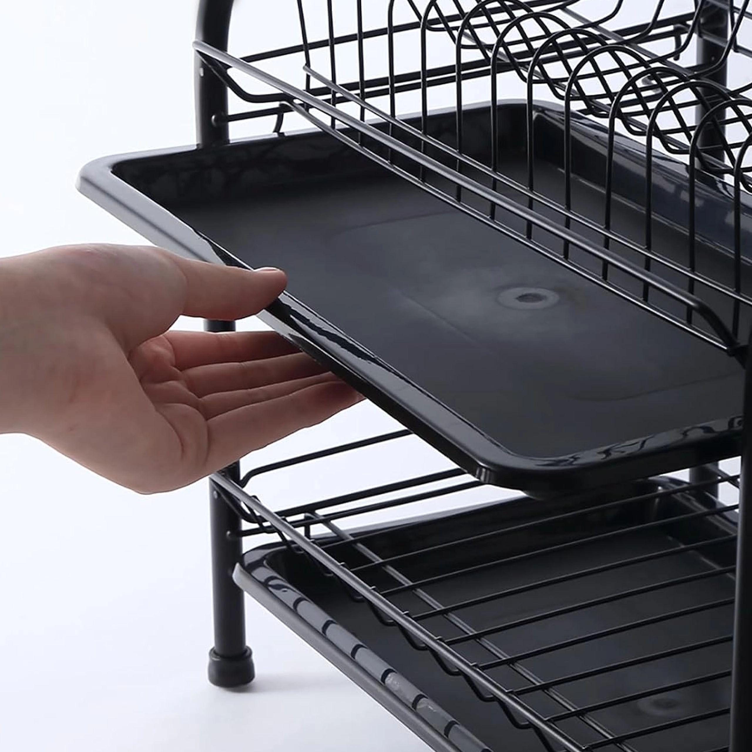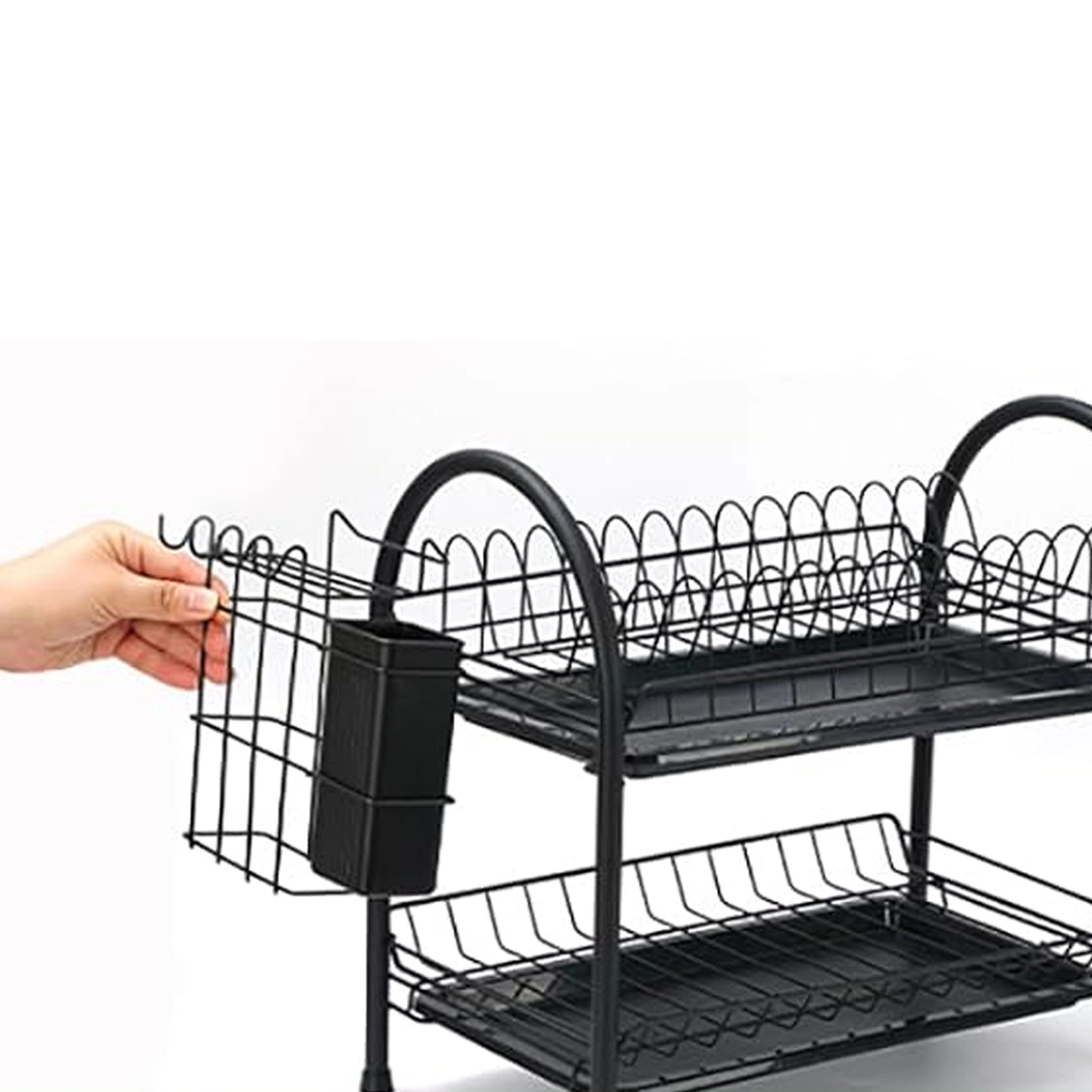 Praktično dvostopenjsko odcejalno stojalo za posodo iz trpežne kovine v elegantni črni barvi ponuja veliko kapaciteto, stabilno konstrukcijo in odstranljive odcejalne pladnje za suho in čisto delovno površino. Zahvaljujoč dvema nivojema učinkovito posuši krožnike, sklede, kozarce in pribor ter ohranja kuhinjo urejeno.