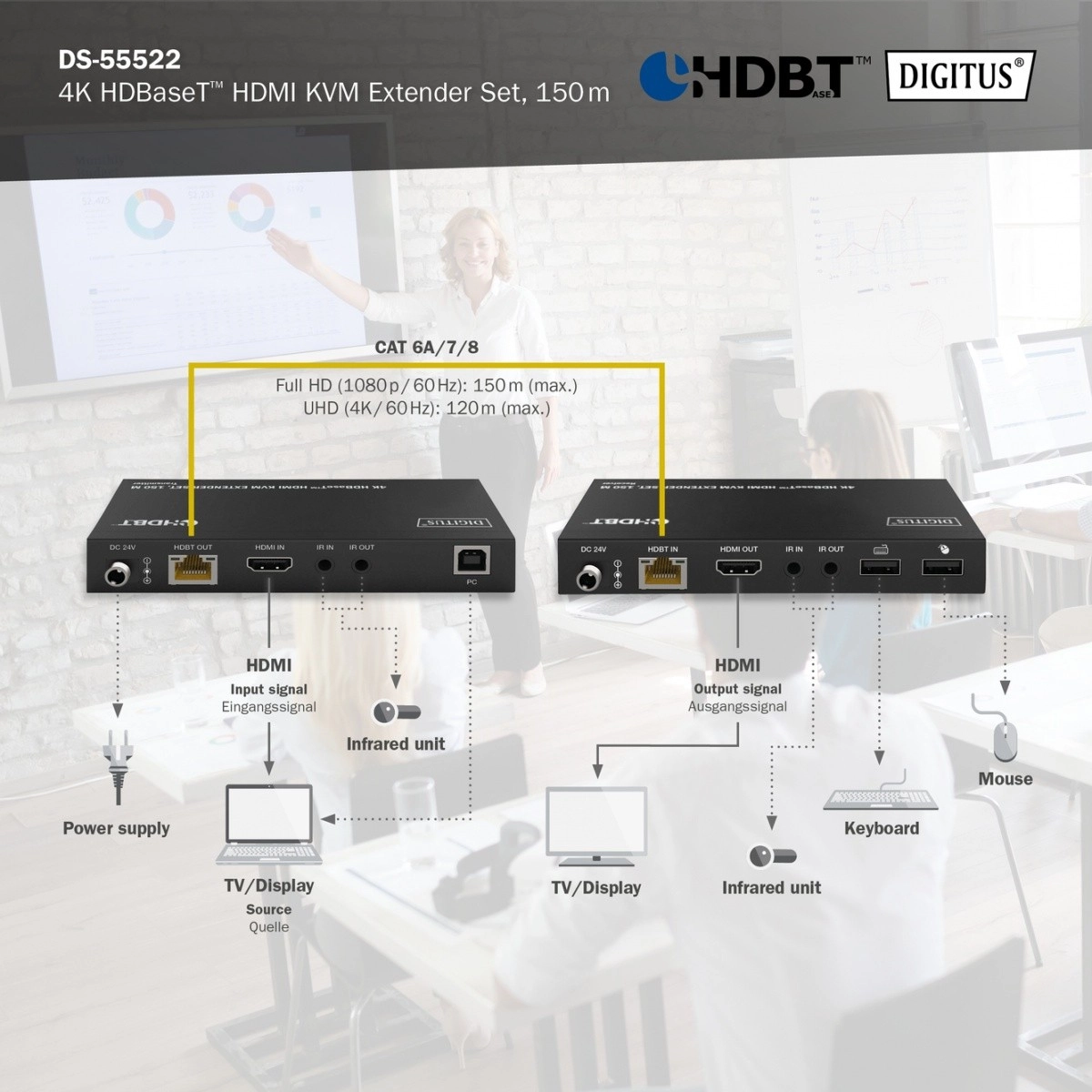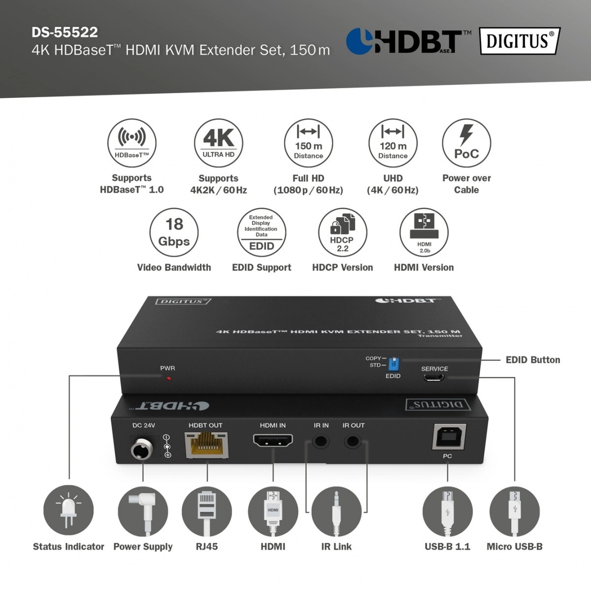 Profesionalni HDMI extender s tehnologijo HDBaseT prenaša nekompresiran 4K video pri 60 Hz (4:4:4) na dolge razdalje do 150 m prek omrežnega kabla CAT6A/7/8. Ponuja PoC napajanje (dovolj je priključiti le en modul), dvosmerni IR, upravljanje EDID in priročno KVM upravljanje prek dveh USB priključkov na sprejemniku.